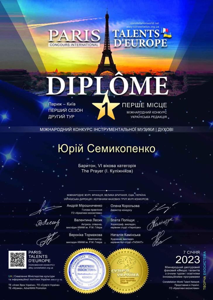 Юрій Семикопенко посів перше місце у міжнародному конкурсі талантів. Музикант у супроводі оркестру поліції Сумщини виконав авторський твір «The Prayer», який написав його колега Іван Куліжніков.