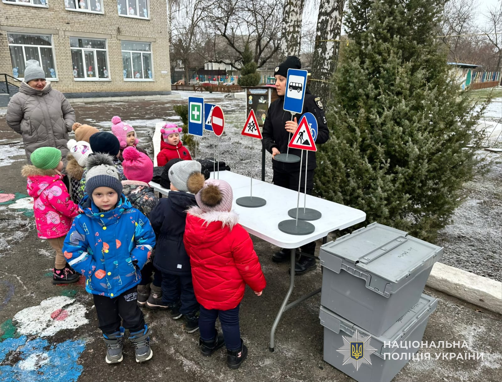 Використовуючи спеціальний килимок "Дорожній рух" із макетами дорожніх знаків та розмітки, інспектор ювенальної превенції пояснила правила дорожнього руху та наголосила на важливості використання світловідбиваючих елементів у темну пору доби. У цікавій ігровій формі діти дізналися про значення дорожніх знаків, безпечні місця для переходу вулиці та основні правила поведінки вдома й на вулиці.
