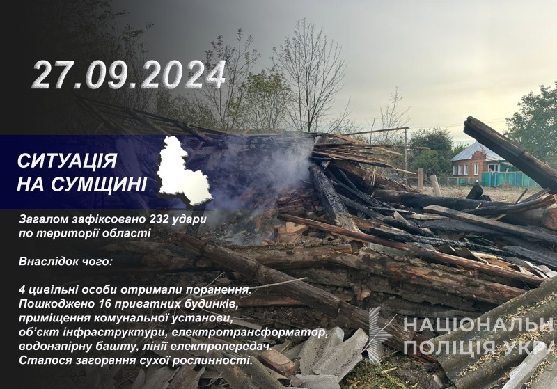 Через ворожі обстріли 4 мирні жителі отримали поранення: поліція Сумщини документує наслідки російських атак