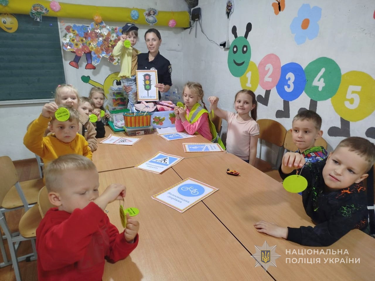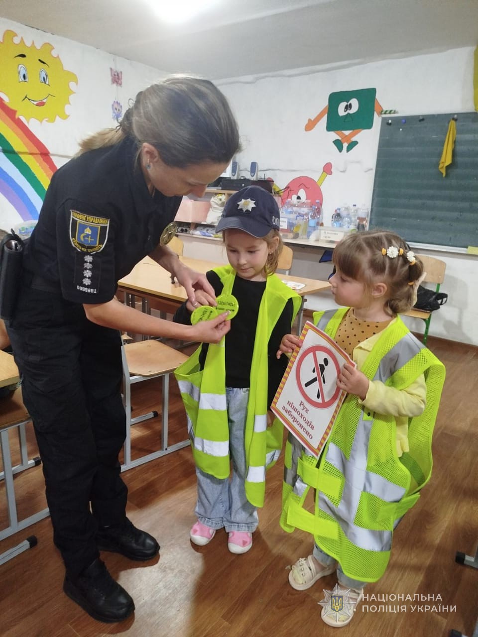 Під час заходу поліцейська доступно й цікаво пояснила дітям, як поводитись на пішохідному переході, чому важливо носити світловідбиваючі елементи в темну пору доби, та що робити, якщо побачили порушення правил на вулиці.