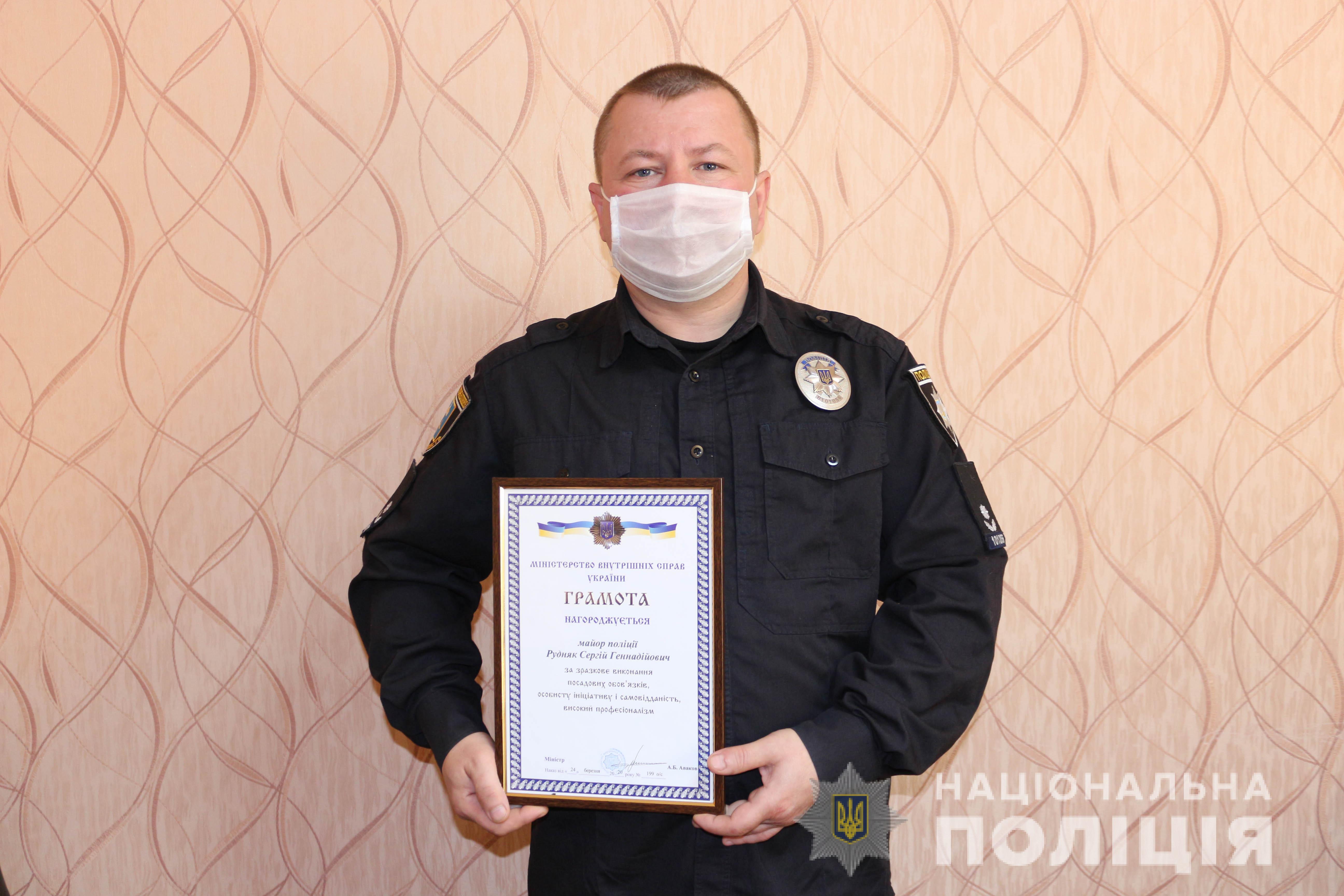 За успішне і сумлінне виконання службових обов'язків, вагомий особистий внесок у справу забезпечення прав і свобод людини, підтримання публічної безпеки і правопорядку, грамотою та подякою наказом НПУ відзначені відповідно майор поліції Сергій Рудняк, заступник начальника Кінологічного центру ГУНП, та старший сержант поліції Роман Ширшонков, поліцейський роти патрульної служби поліції особливого призначення "Суми".