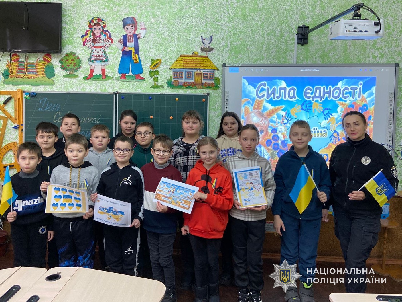 Напередодні дня єдності, правоохоронці завітали до учнів 4 класу однієї з Лебединських шкіл та провели бесіду на тему: "Моя Соборна Україна!". Ювенальні поліцейські нагадали дітям про важливість з’єднання та почуття національної гордості.
