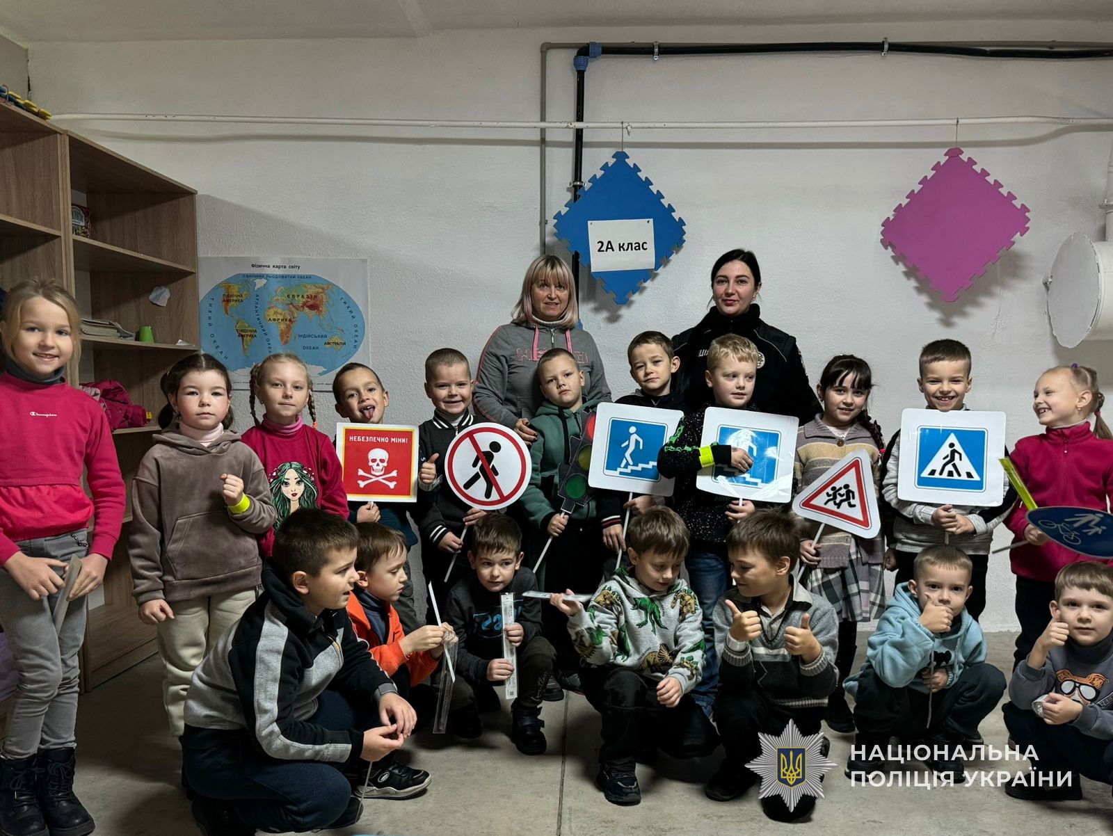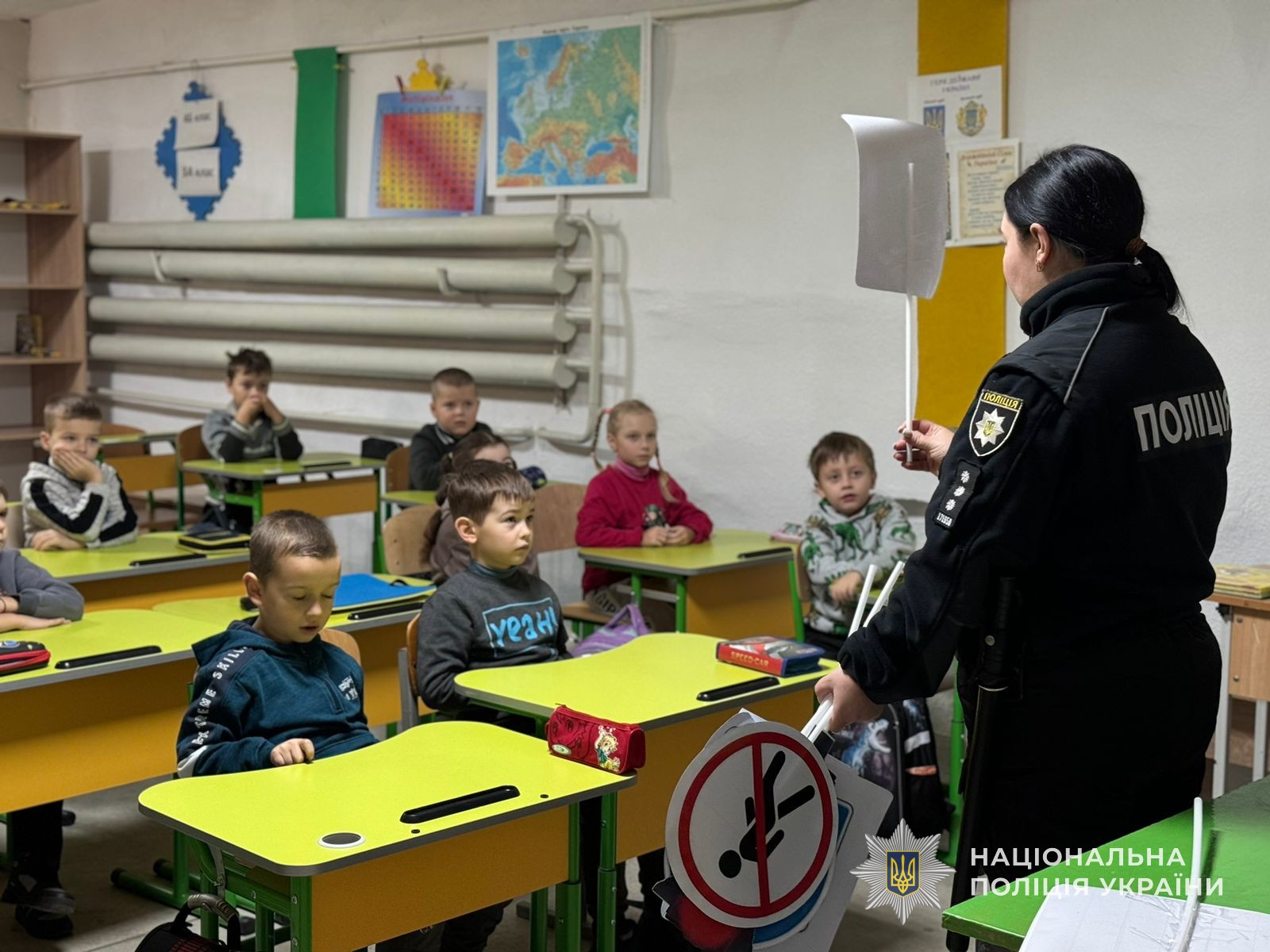Поліцейська роз’яснила дітям значення дорожніх знаків, що регулюють рух пішоходів. Нагадала як правильно переходити дорогу, де немає світлофора. Окрім того, інспекторка звернула особливу увагу на те, що в темну пору доби варто значно уважніше переходити проїзну частину та в жодному разі не перебігати через дорогу та не гратись поблизу неї.
