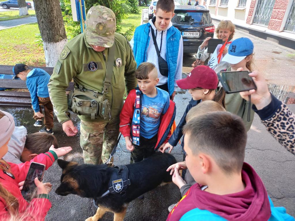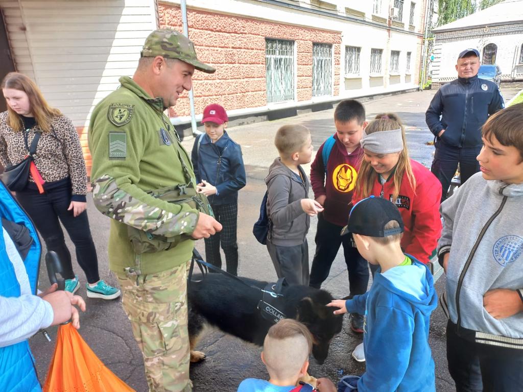 Екскурсія розпочалась на подвір’ї, правоохоронці розповіли дітям як організована служба в поліції та які завдання вони виконують. Після цього діти спостерігали за роботою службового собаки, який демонстрував навички з пошуку особистих речей.