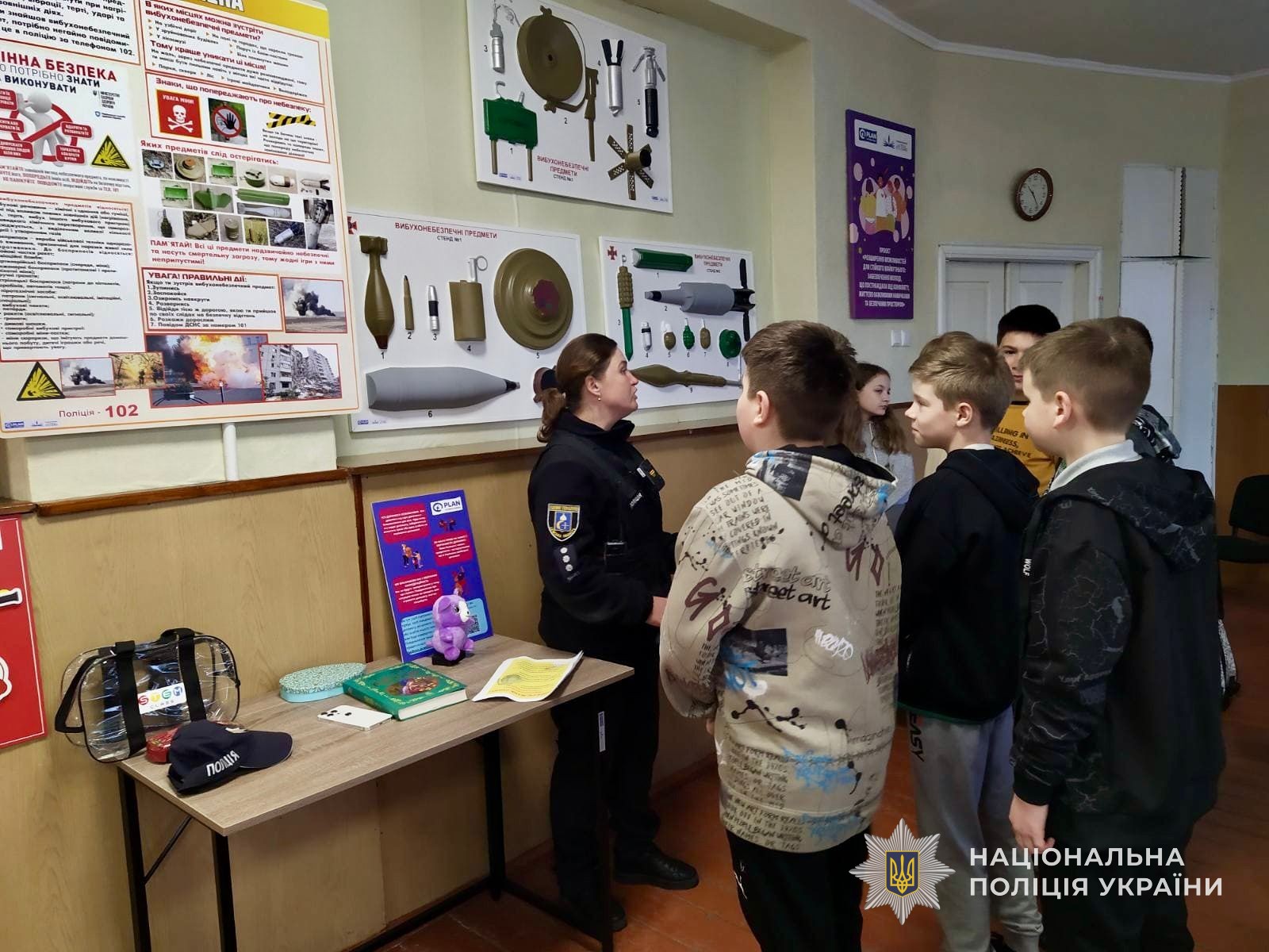 Поліцейська на макетах показала як можуть виглядати міни, боєприпаси та вибухонебезпечні предмети. Попередила, що в разі виявлення таких предметів не наближатись та не торкатись їх. Одразу зателефонувати на короткі номери 101 або 102 та повідомити про небезпечну знахідку дорослим.