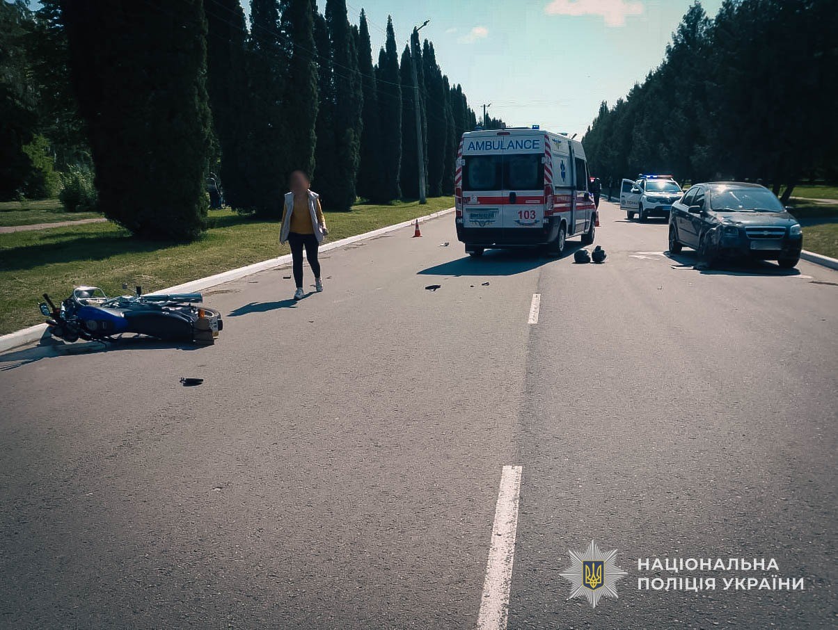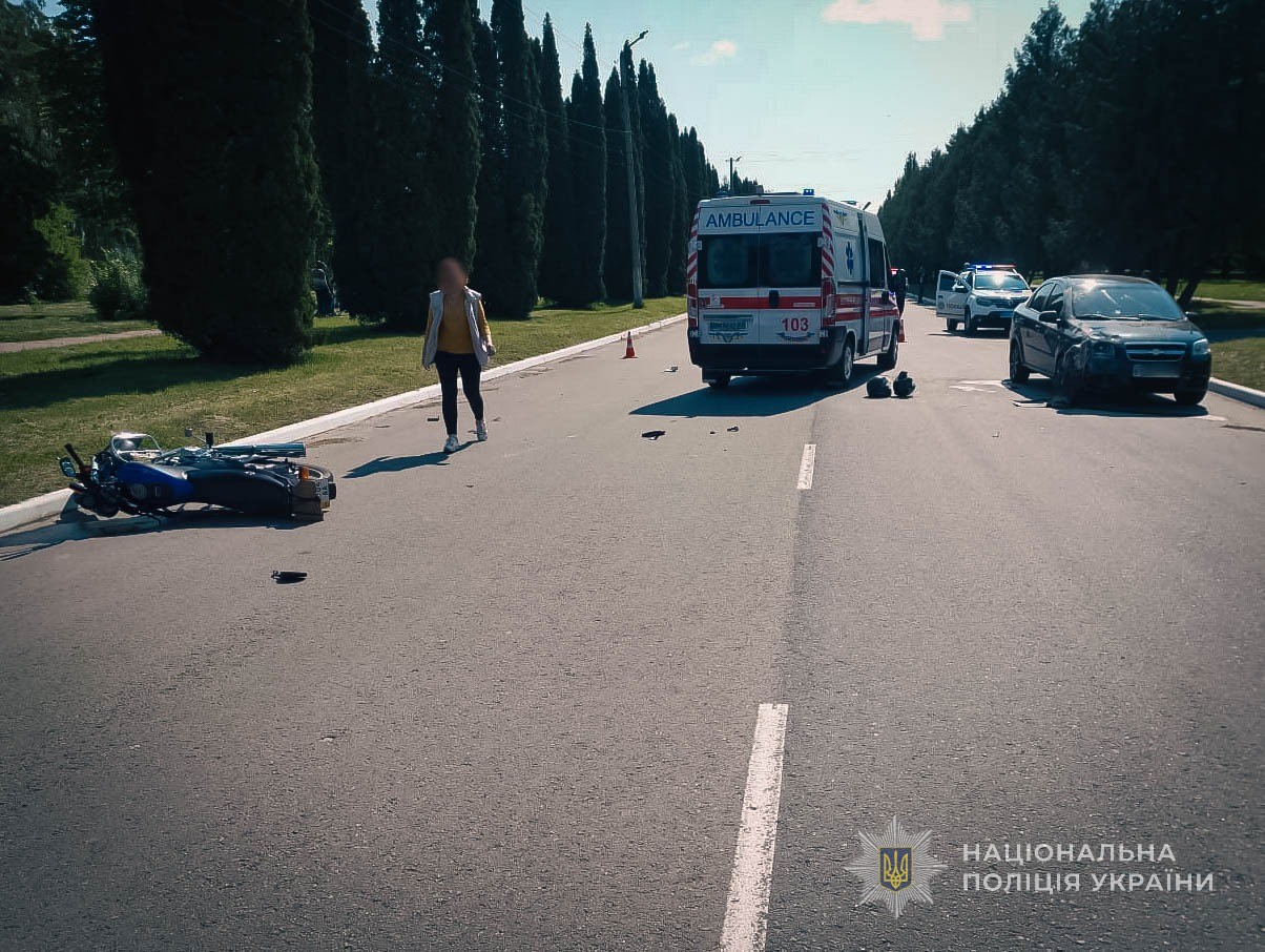 Внаслідок зіткнення легковика та мотоцикла тілесні ушкодження отримали водій та пасажир двоколісного транспорту. На місце події працювала слідчо-оперативна група поліції.