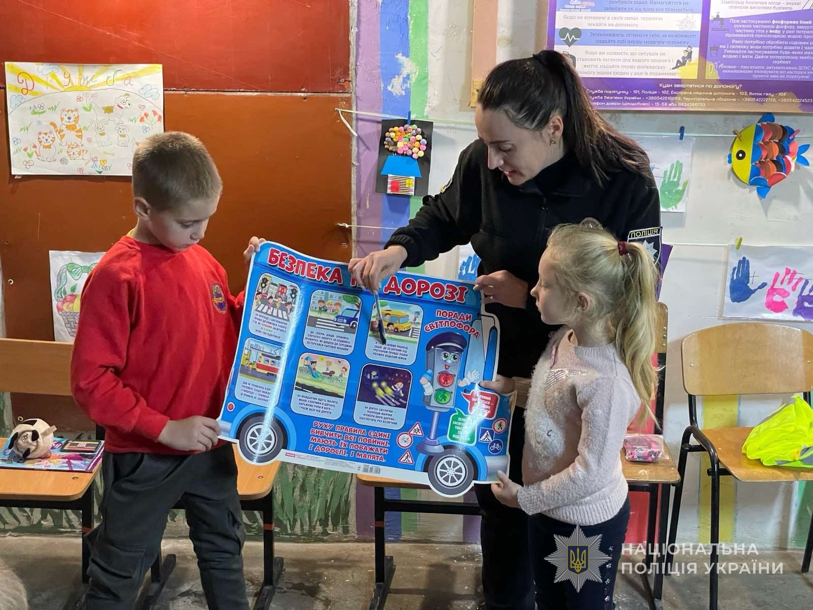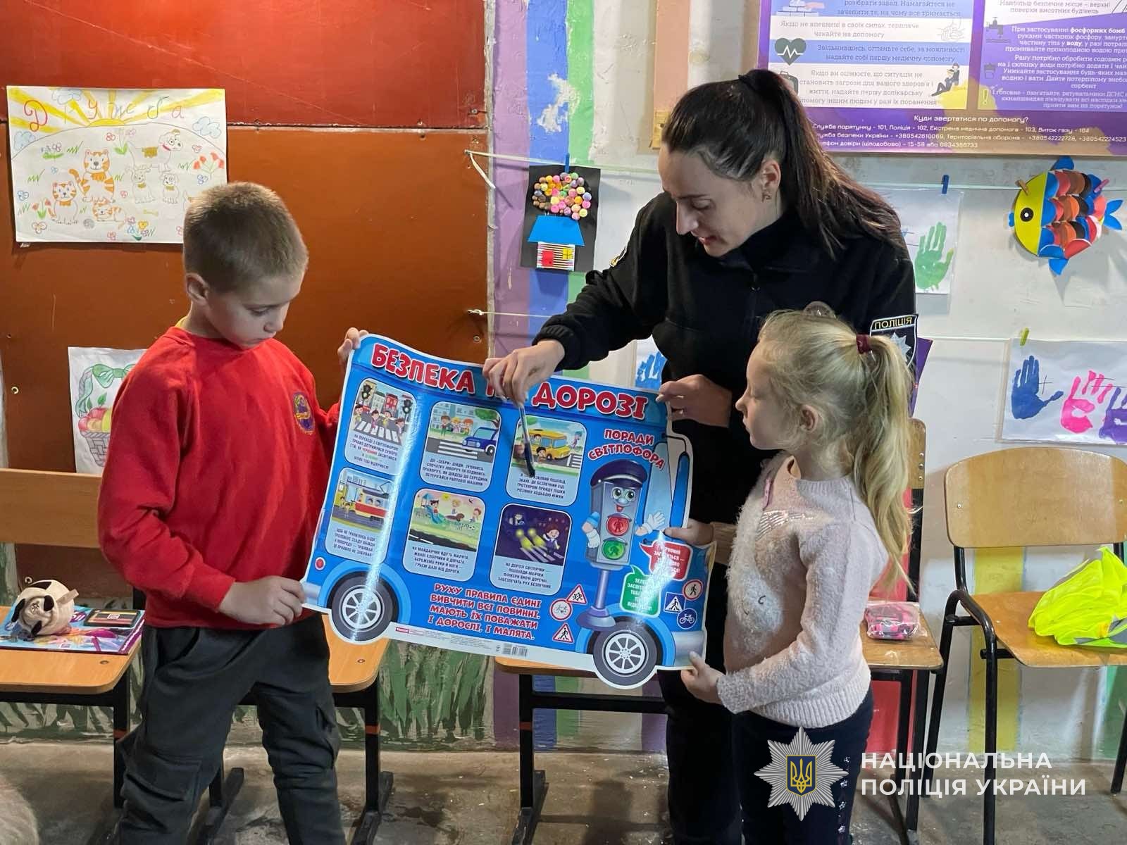 Під час пізнавальної лекції поліцейська розповіла, що означають і про що попереджають сигнали світлофора та дорожні знаки. Окремо обговорили, як потрібно переходити дорогу та правила безпеки під час катання на велосипеді та на роликах.