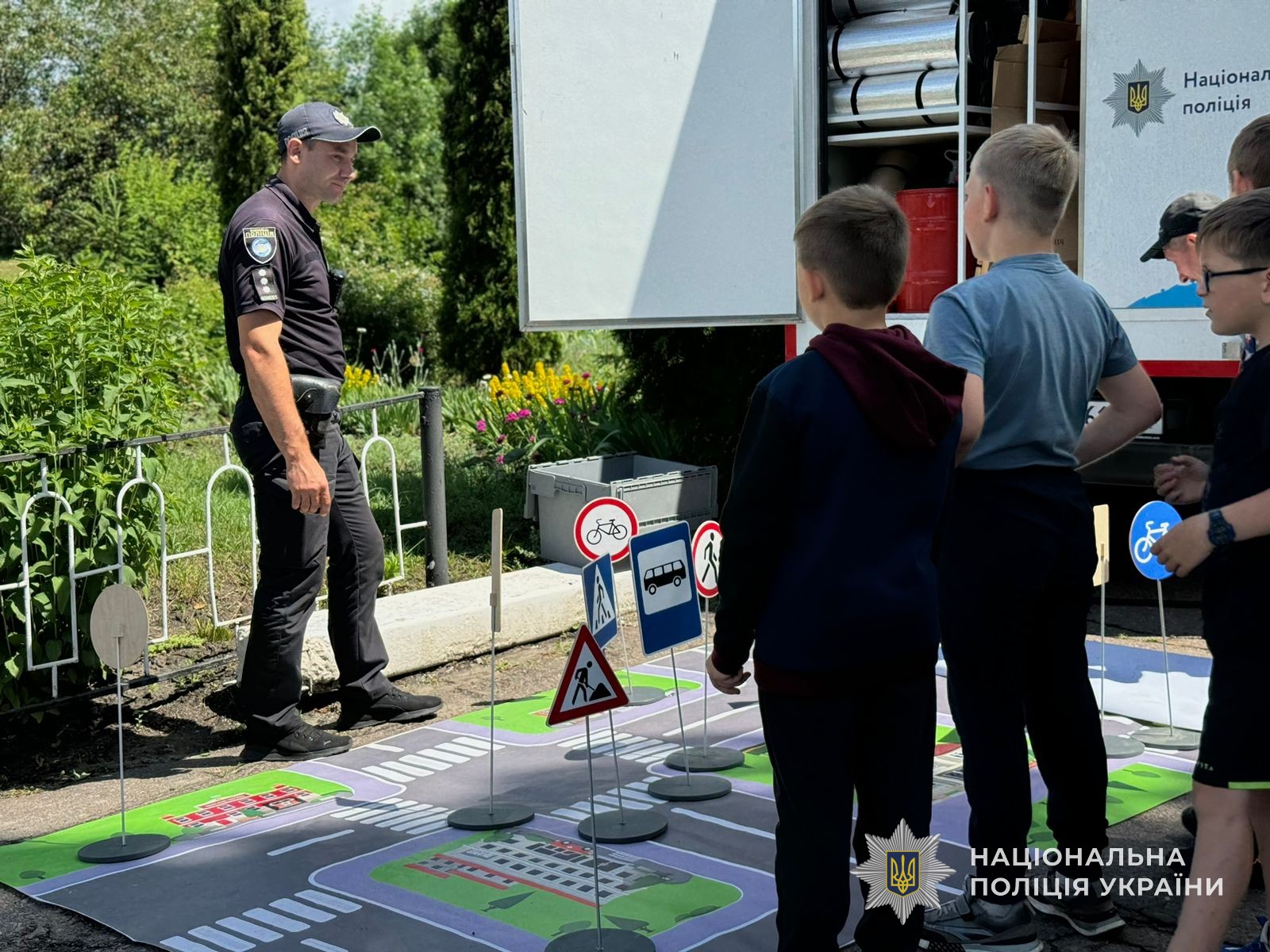 Інспектор ювенальної превенції нагадав найменшим громадянам правила дорожнього руху: завдяки інтерактивній моделі проїзної частини поліцейський роз’яснив значення деяких дорожніх знаків та розповів як діяти в ситуаціях, що можуть скластись на дорозі.