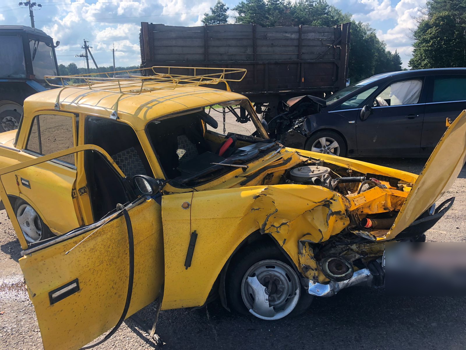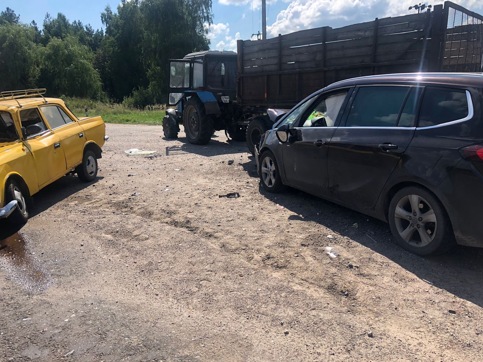 Проведеними першочерговими слідчими діями правоохоронці попередньо встановили, що 52-річний чоловік керуючи автомобілем «Москвич» допустив зіткнення з автомобілем «Opel» під керуванням 38-річної жінки. Після чого відбулося зіткнення вказаних автомобілів з трактором «Білорус», який стояв на перехресті та пропускав вказані транспортні засоби.