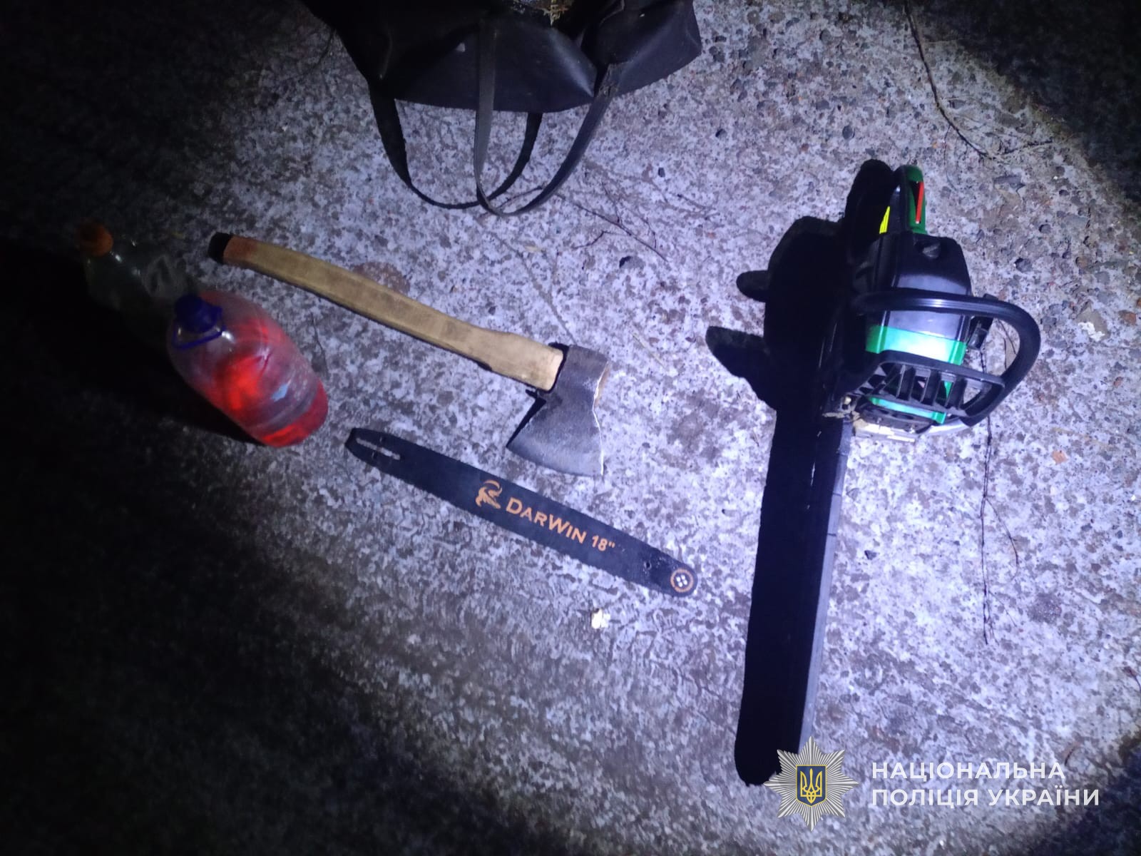 Під час патрулювання поліцейські офіцери громади виявили двох чоловіків, які вже встигли завантажити незаконно зрубану деревину на причіп. Правоохоронці негайно припинили їхні дії та вилучили бензопилу, сокиру і спиляні колоди дерев.