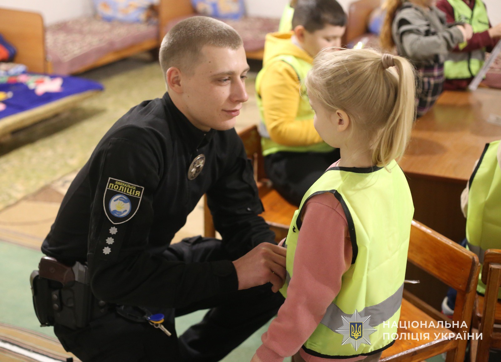 Після гри співробітники поліції пояснили юним слухачам чому саме в темну пору доби пішоходи повинні мати на одязі світловідбиваючи елементи. Аби в темряві на дорозі діти були у безпеці, інспектори подарували їм флікери.