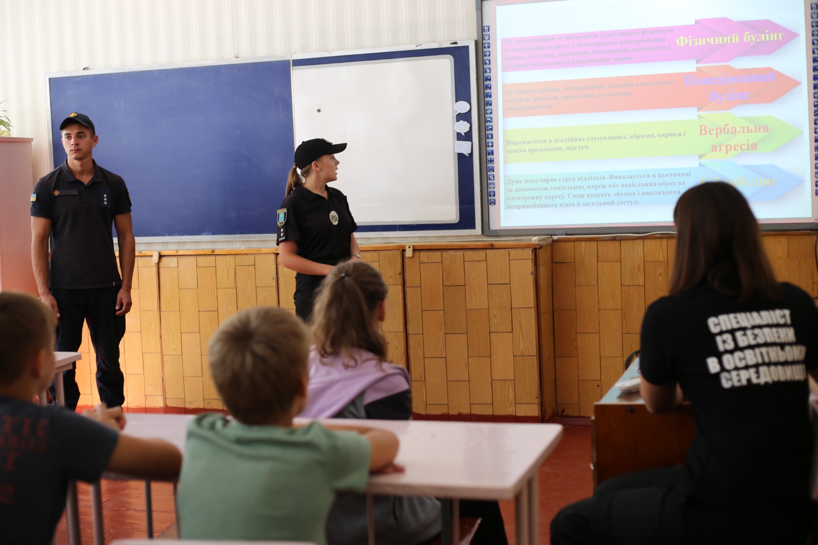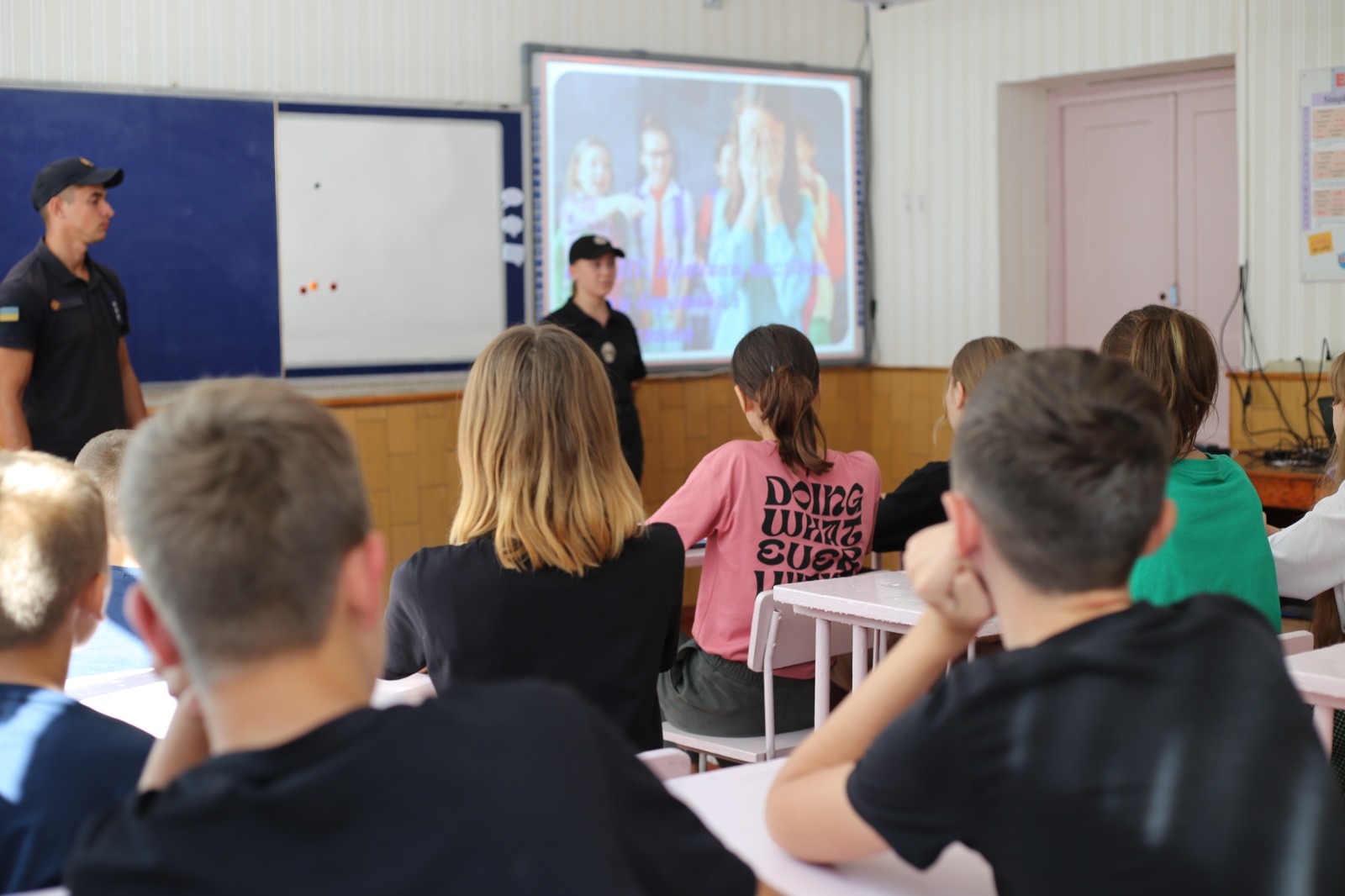 На початку заходу зі школярами було проведено урок, під час якого правоохоронці та рятувальники роз’яснили дітям як потрібно себе поводити при виявленні невідомих, підозрілих або вибухонебезпечних предметів. Також, працівники поліції нагадали присутнім про таке негативне явище, як булінг. Закликали школярів ніколи не замовчувати про випадки цькування у школі та негайно інформувати про це дорослих або ж телефонувати в поліцію за номером 102.