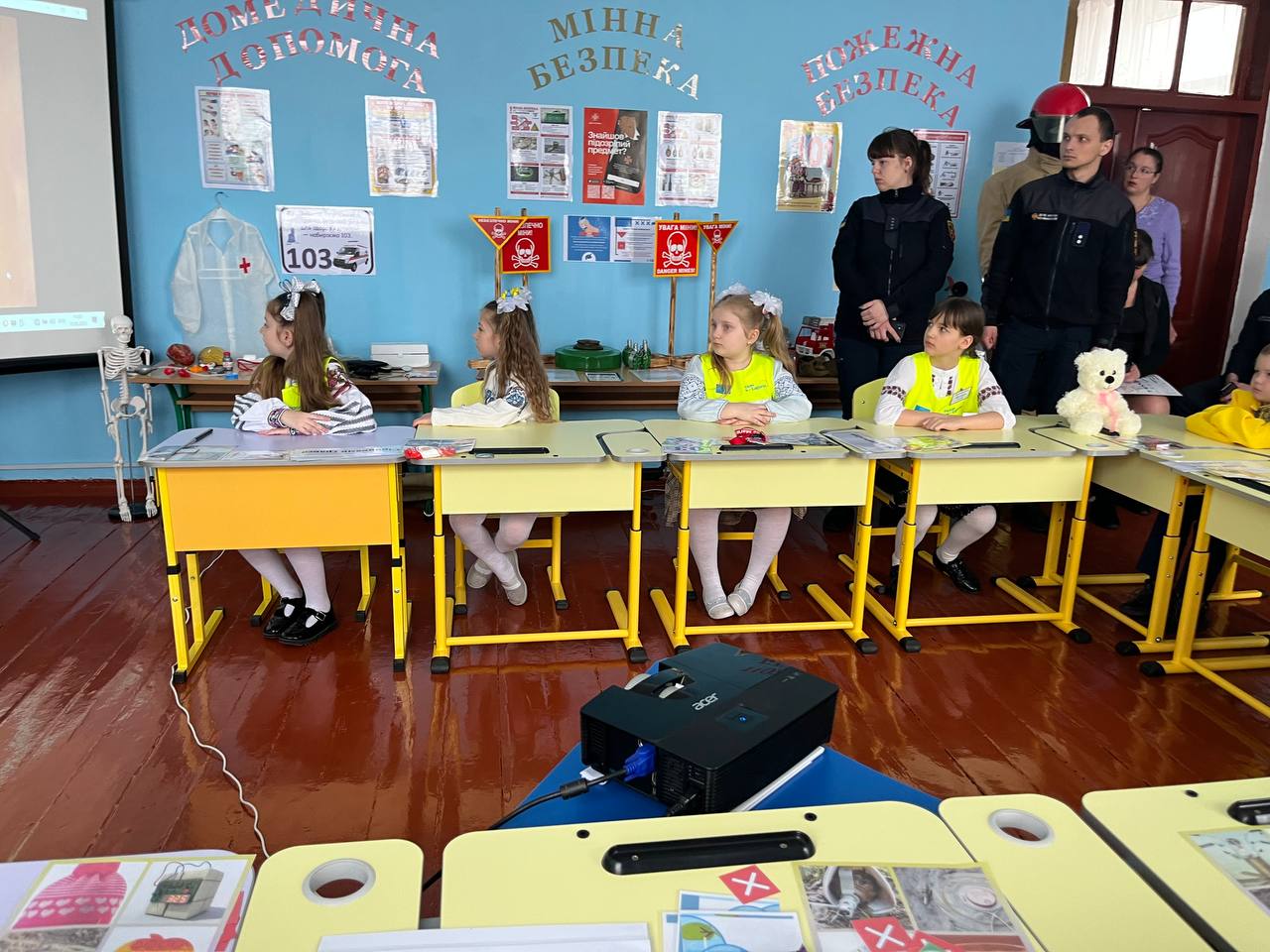 Правоохоронець з рятувальниками нагадали учням про правила мінної безпеки, ознайомили школярів з алгоритмом дій у разі виникнення надзвичайних ситуацій, пояснили, як правильно надавати домедичну допомогу та як потрібно діяти під час сигналу “Повітряна тривога”.