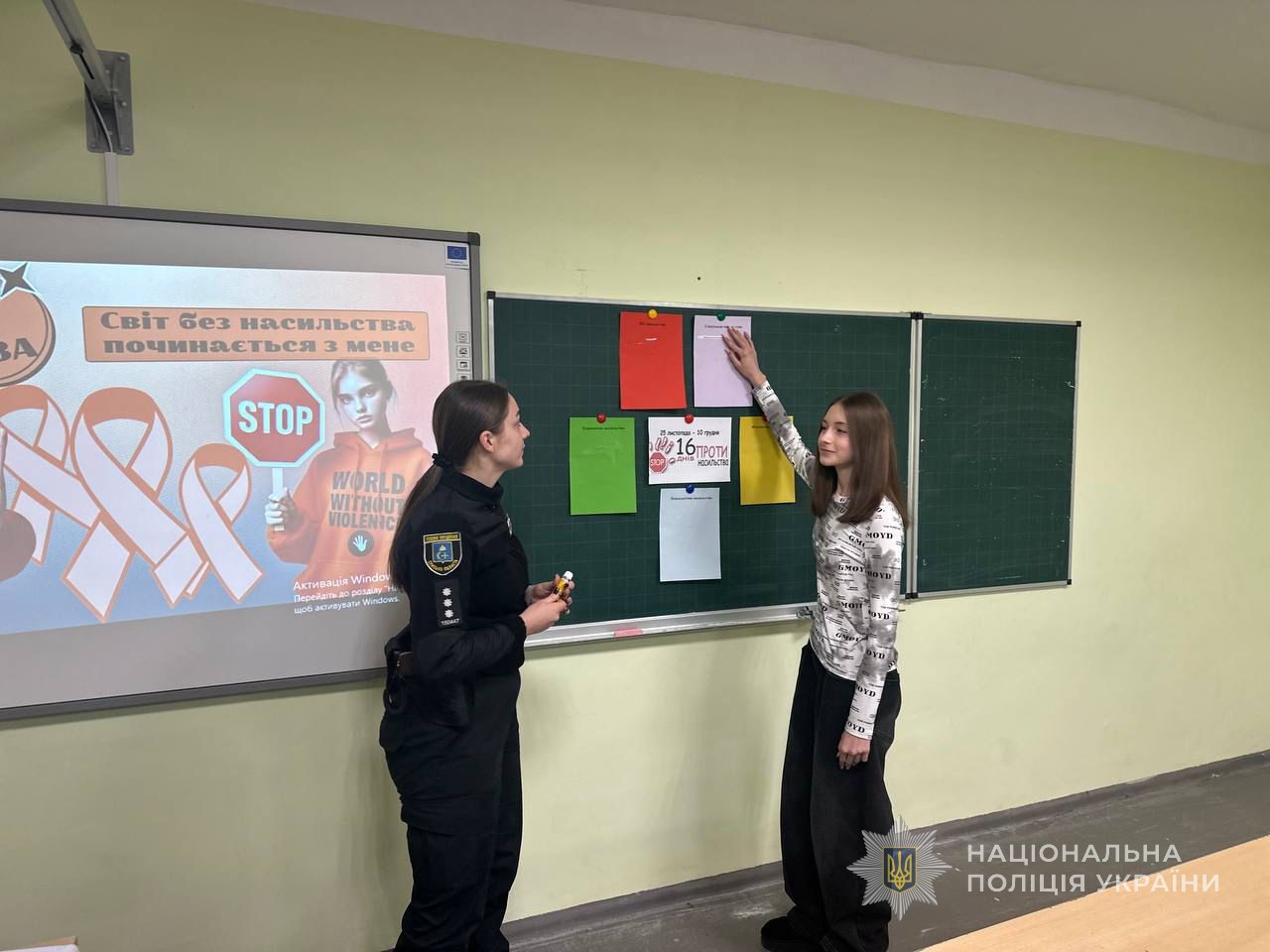 Тривають профілактичні заходи в межах всеукраїнської акції «16 днів проти насильства». Поліцейські відвідують навчальні заклади, щоб у доступній формі пояснити дітям, як розпізнати небезпечні ситуації та куди звертатися по допомогу.