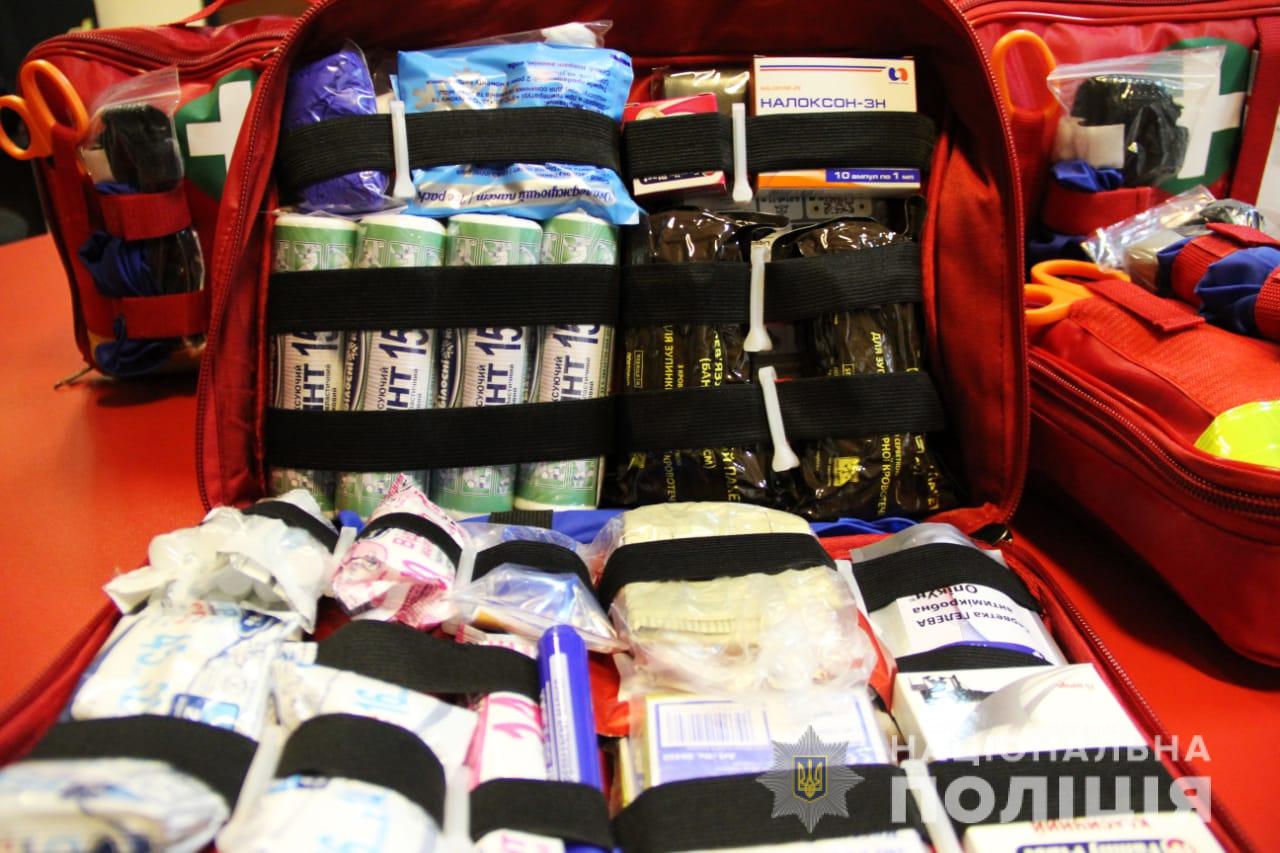 Аптечки укомплектовані рукавичками, шприцами, шинами, джгутами, бинтами, пластирами, протиопіковими та марлевими серветками, плівками-клапанами для штучної вентиляції легень, ножицями, маркерами, термопокривалами, косинками для іммобілізації кінцівок, холодовими та перев’язувальними пакетами. Крім того, у кожній такій аптечці є препарат «Налоксон», який може врятувати життя людині при передозуванні наркотиками.