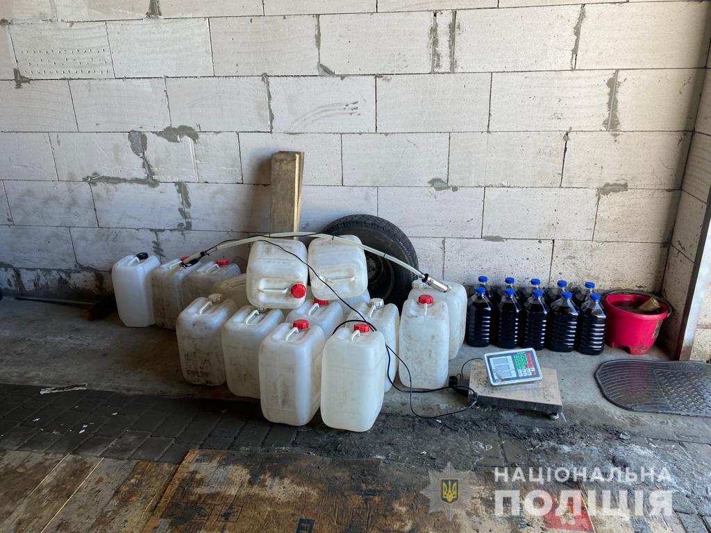 В одному з приміщень на території домоволодіння правоохоронці виявили підпільне виробництво алкоголю. Звідти вилучили дві пластикові ємності об’ємом по 1000 л, наповнених прозорою рідиною, схожою на спирт, 20 каністр об’ємом по 20 л із залишками рідини, схожої на спирт, 12 пластикових пляшок об’ємом по 5 л, наповнених коричневою рідиною, 400 тетрапаків, цукор, фільтри та чимало пустої тари, кришок.