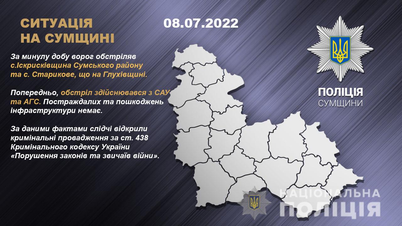 Ворог обстріляв с.Іскрисківщина Сумського району та с. Старикове, що на Глухівщині.