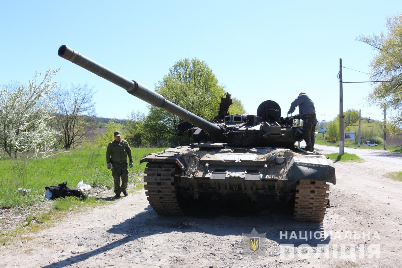 Ще один небезпечний об’єкт, танк Т – 90, знищений нашими оборонцями на в’їзді в Суми і відомий жителям обласного центру по розміщеному на ньому транспаранті «руський корабль» мав в середині корпусу майже не використаний боєкомплект – близько тридцяти снарядів калібру 125 міліметрів. Всі вони, як стверджує головний спеціаліст відділу забезпечення вибухобезпеки Управління вибухотехнічної служби Національної поліції України Михайло Трохименко, споряджені підривачами і піддалися дії вогню. Діставати їх треба з башти танку з великою обережністю. Так само обережно транспортувати до місця знищення.