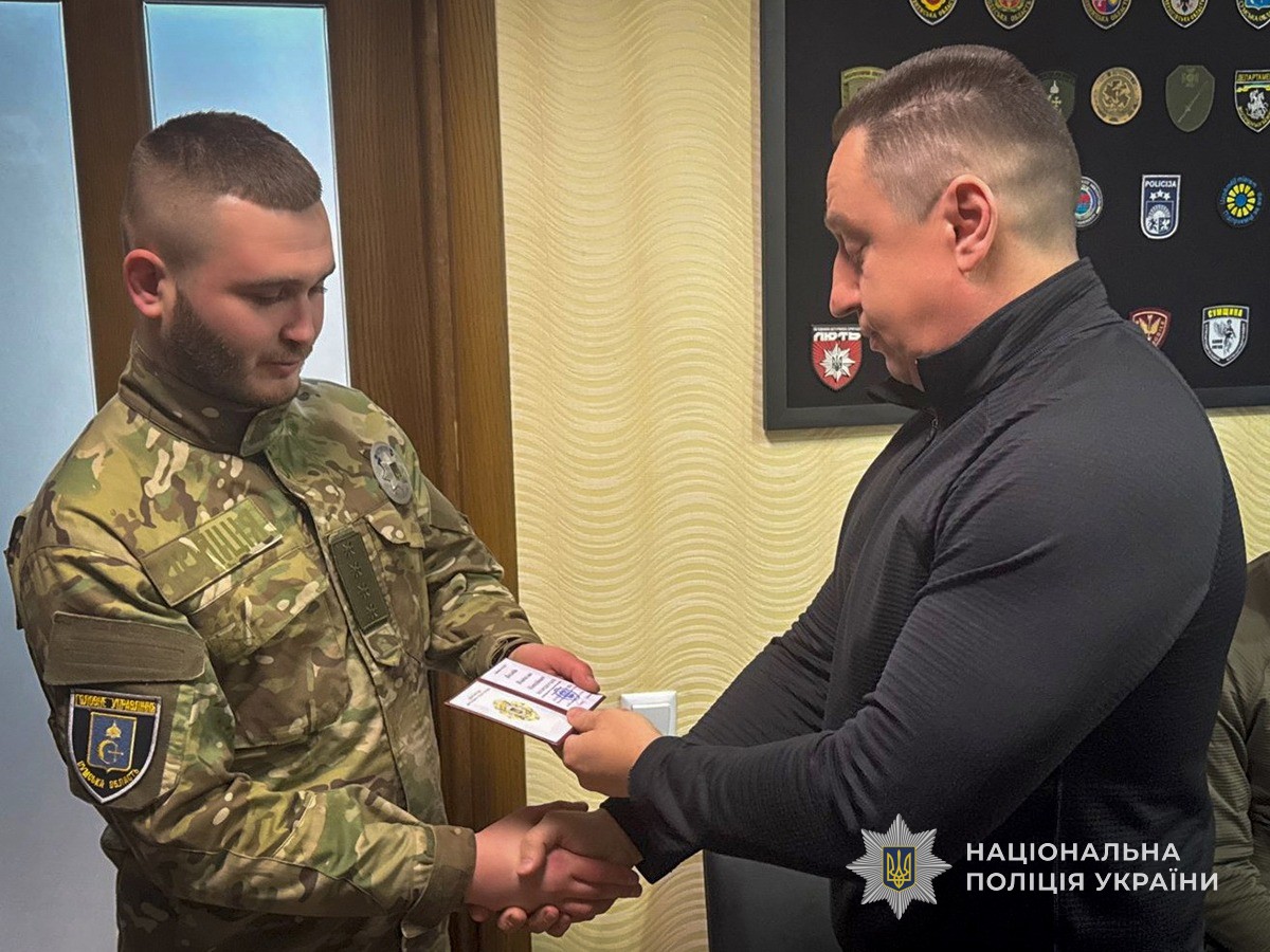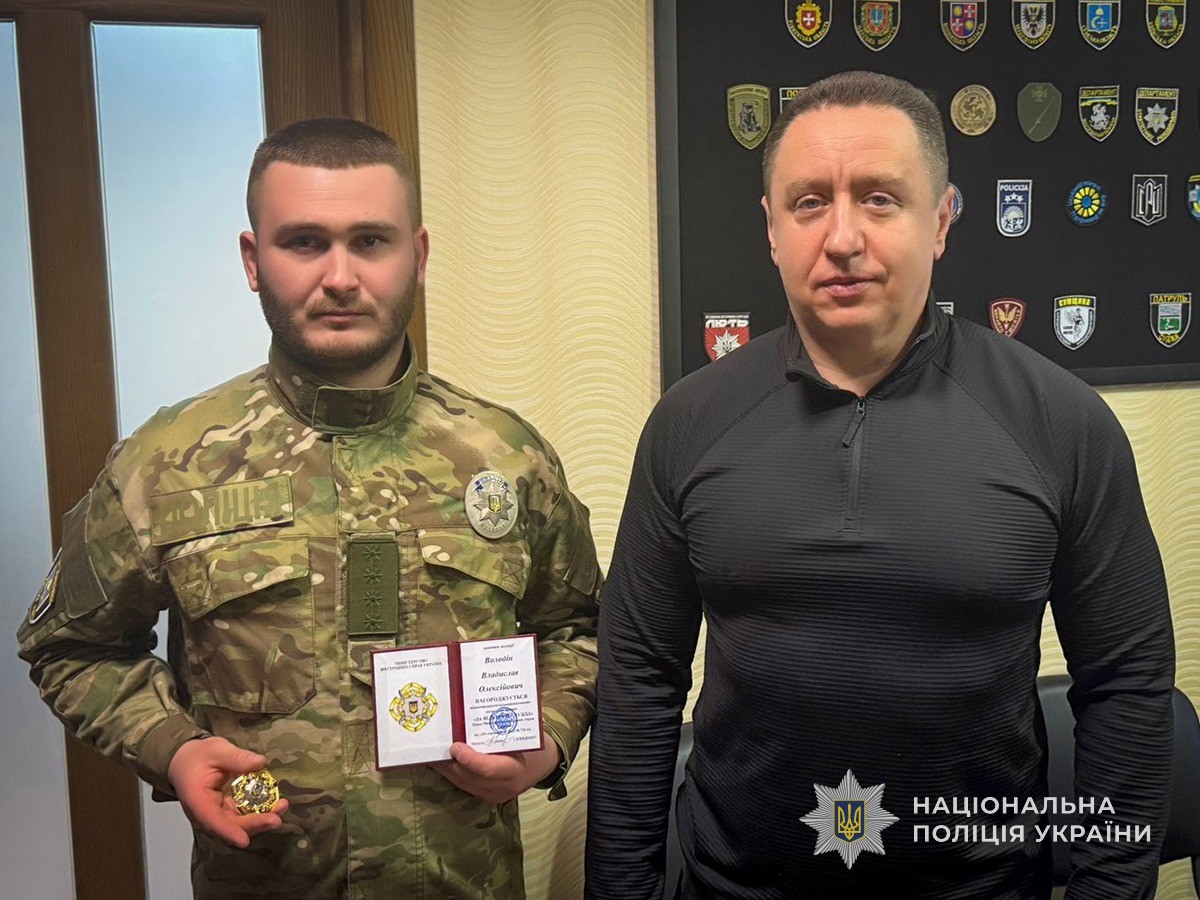 Начальник ГУНП в Сумській області полковник поліції Олег Кашперук вручив інспектору управління вибухотехнічної служби Владиславу Володіну нагрудний знак Міністерства внутрішніх справ України «За відвагу у службі».