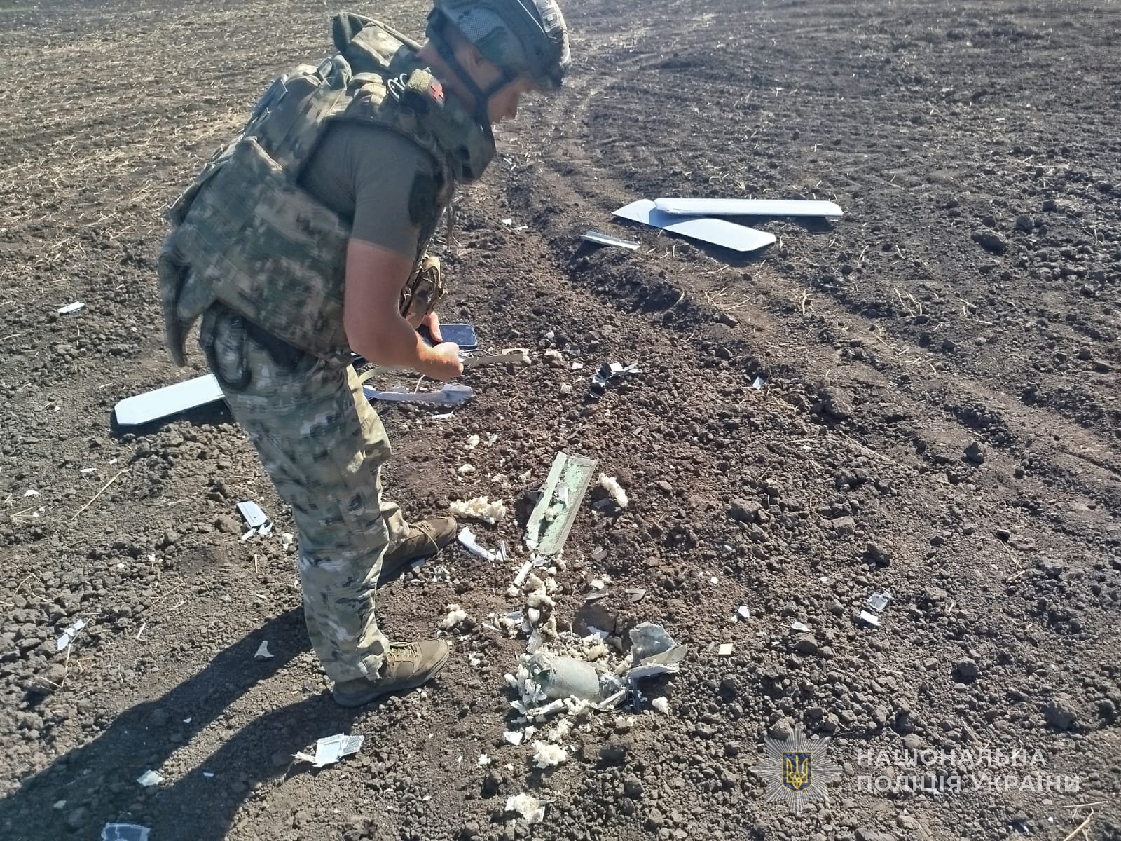 Прибувши на місце падіння безпілотника, вибухотехніки поліції оглянули уламки, провели знешкодження його бойової частини фугасно-уламкової дії, вивезли її у спеціально відведене місце та знищили шляхом підриву.