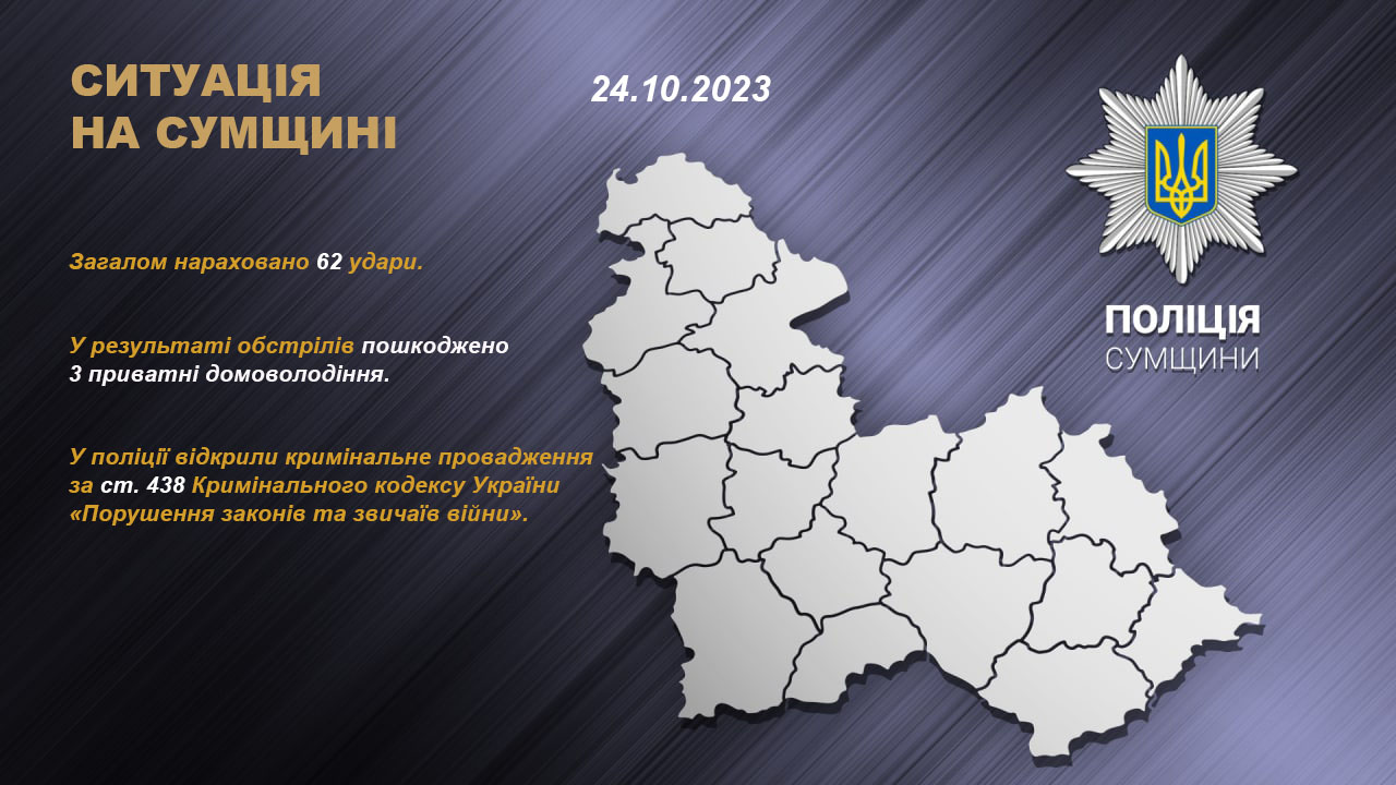Упродовж минулої доби російські війська обстрілювали територію області. Загалом зафіксовано 62 удари.