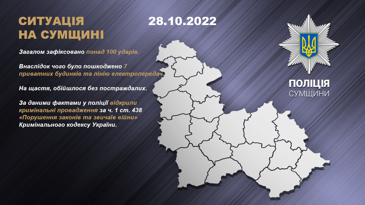 Протягом минулої доби ворог вкотре вів вогонь по території Сумської області. Загалом зафіксовано понад 100 ударів.