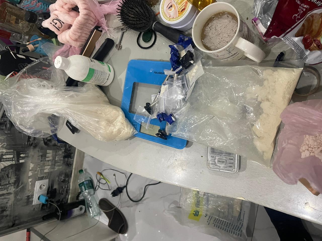 Під час проведення невідкладного обшуку за місцем мешкання зловмисниці поліцейські знайшли 300 грамів психотропної речовини амфетамін, 50 грамів психотропної речовини PVP-солі, а також наркотичні засоби мефидрон загальною вагою 200 грамів та 100 грамів елітного сорту канабісу.