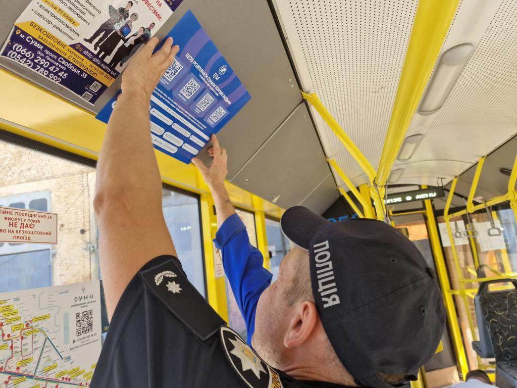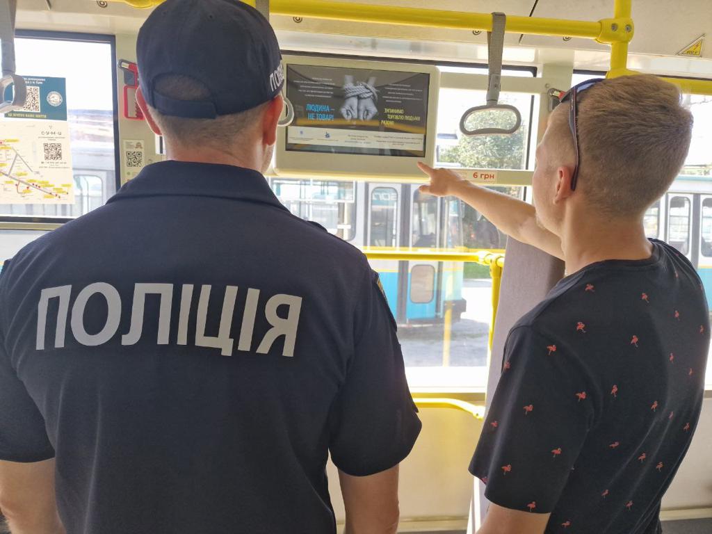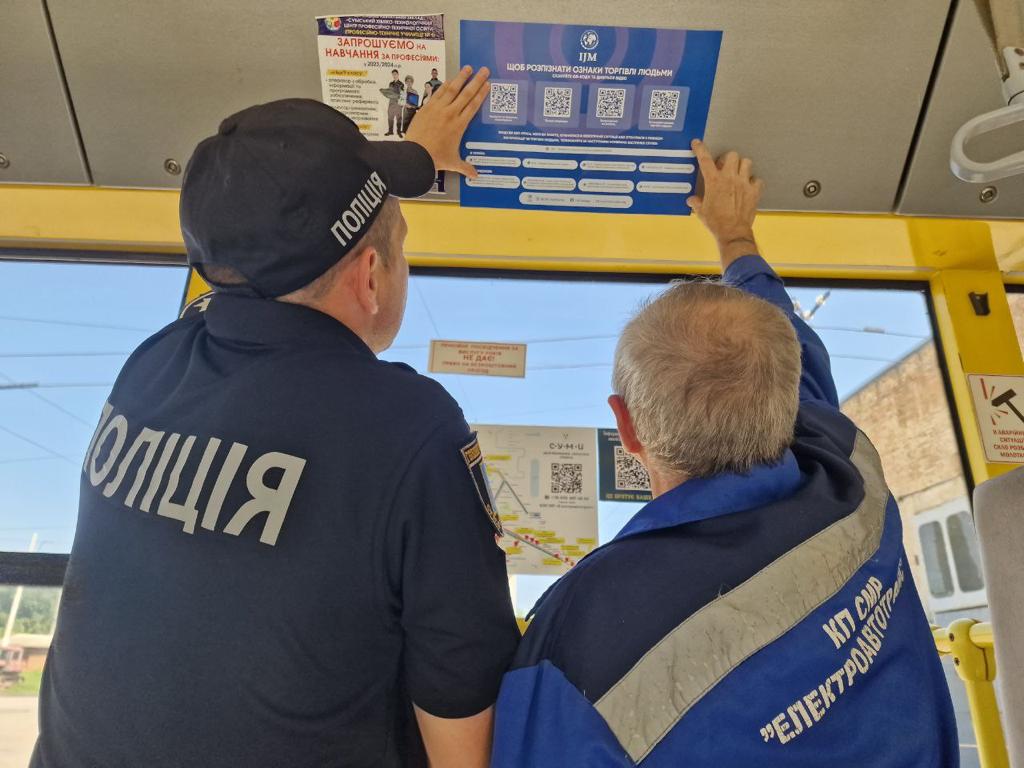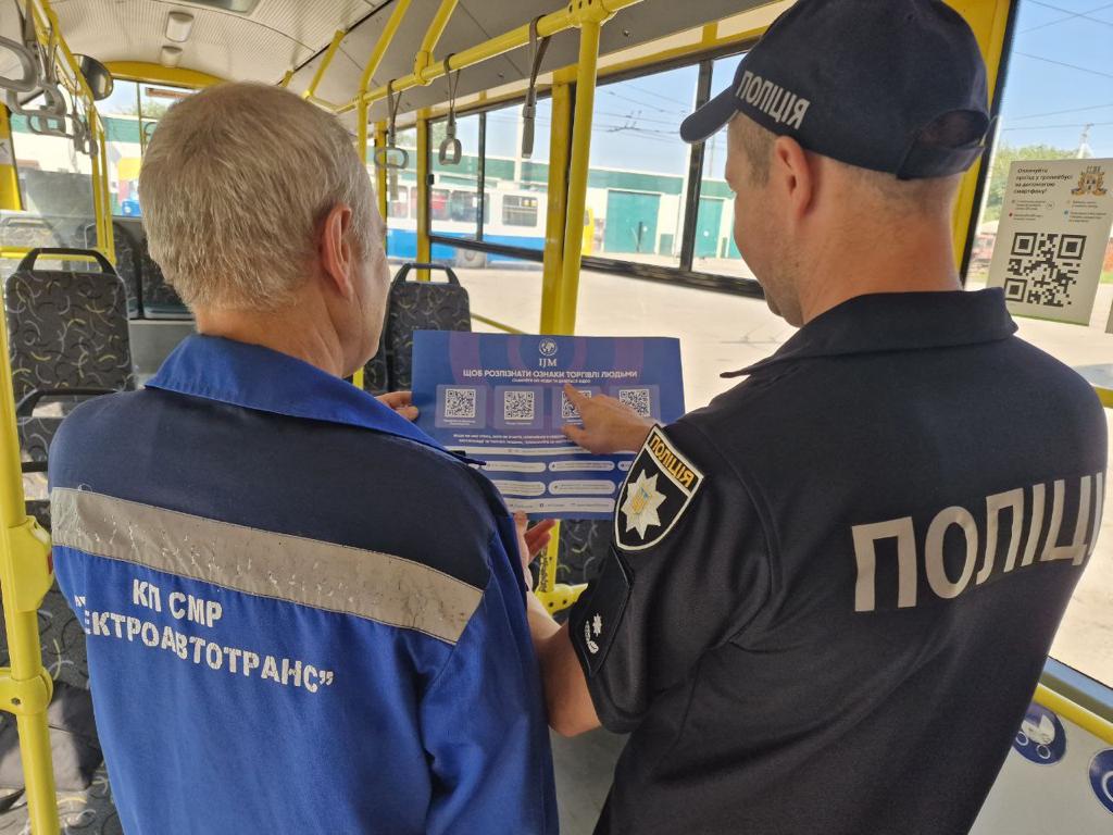 Працівники Управління міграційної поліції ГУНП в Сумській області разом зі співробітниками комунального підприємства Сумської міської ради «Електроавтотранс» об’єднали свої зусилля у боротьбі з торгівлею людьми. Задля цього вони розповсюдили у громадському транспорті тематичні інформери.