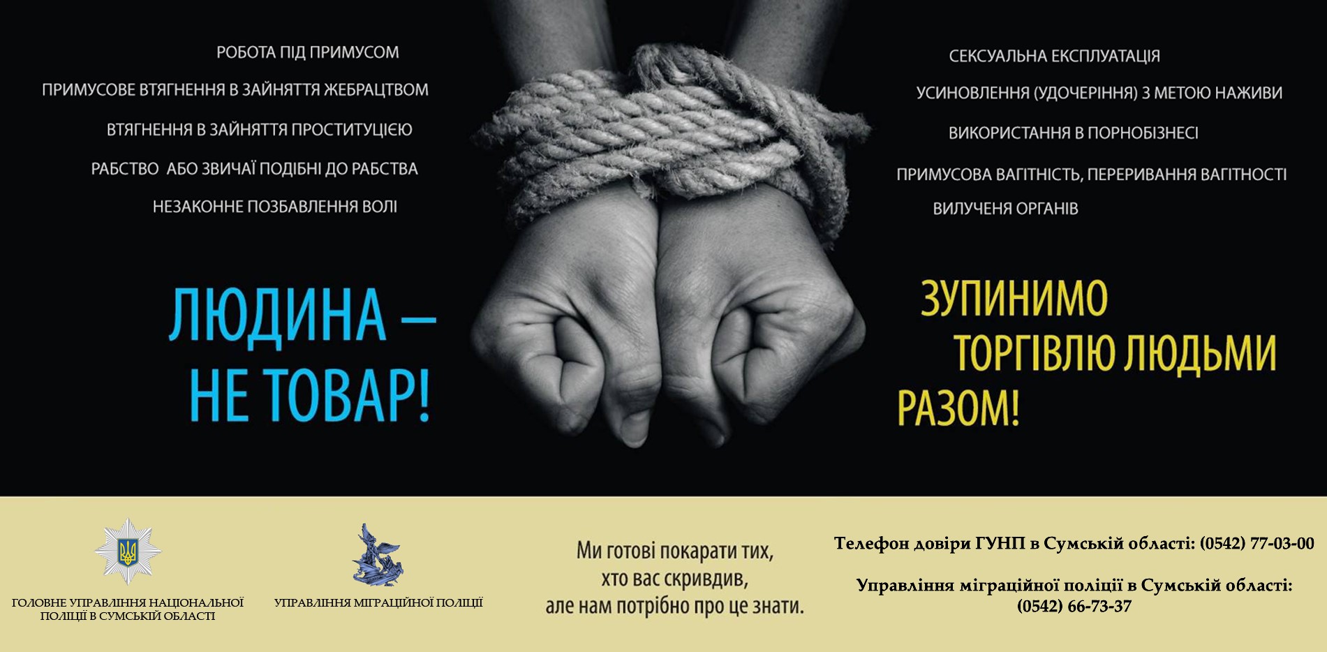 Правоохоронці нагадують, що людина – це не товар, і злочини, пов’язані з торгівлею людьми караються законом. Якщо ви стали жертвою або свідком протиправних дій, зверніться на телефон довіри ГУНП в Сумській області (0542-77-03-00), до Управління міграційної поліції (0542-66-73-37) або за номером 102.