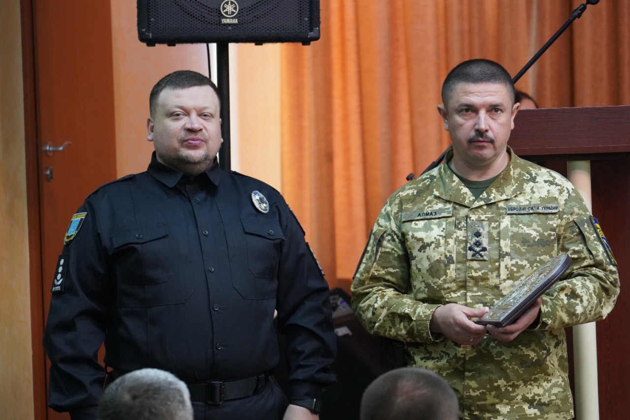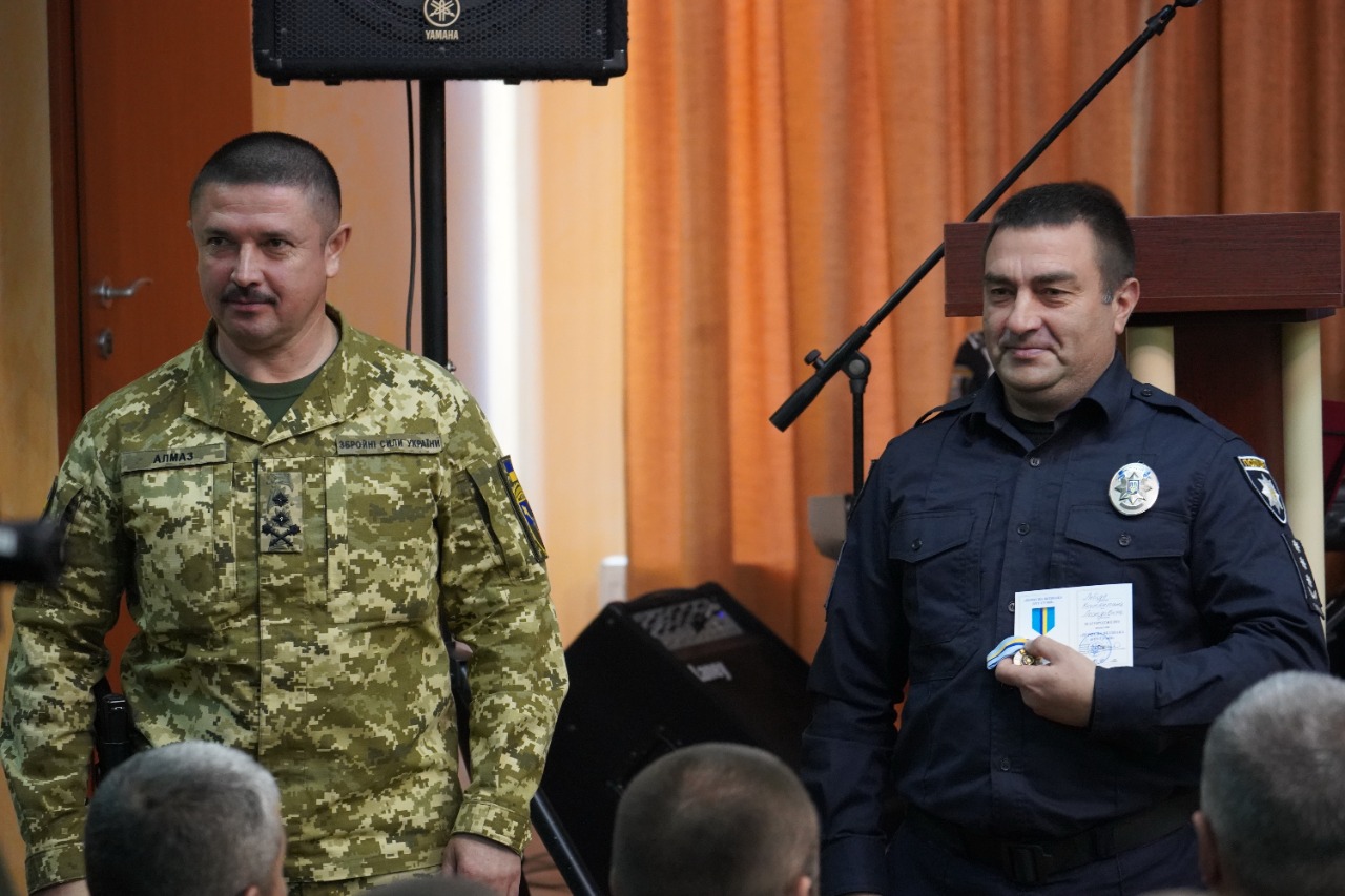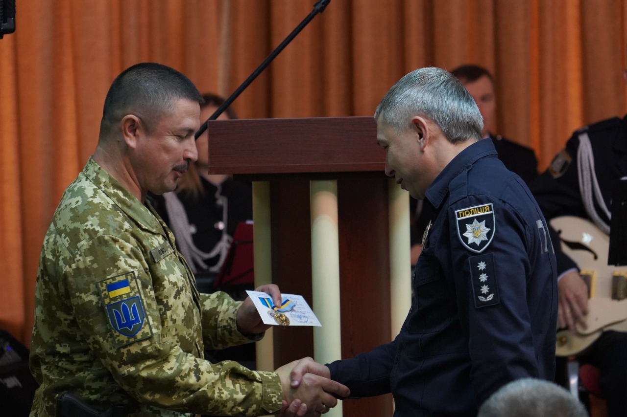 Після цього командир оперативно-тактичного угрупування «Суми» Олександр Нестеренко привітав всіх присутніх зі святом та нагородив очільника поліції Сумщини Сергія Чижа та інших працівників поліції почесними відзнаками та пам’ятною іконою.