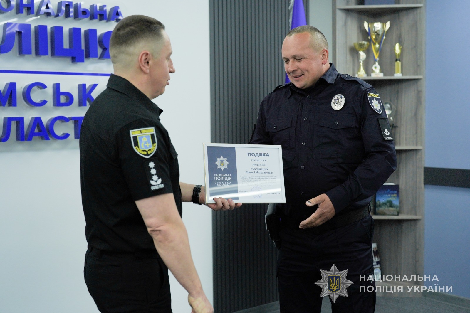 Подяки, грамоти та пам’ятні подарунки отримали поліцейські офіцери, які відзначилися самовідданістю, оперативністю, а головне — здобули довіру мешканців своїх громад. Серед нагороджених — переважно офіцери, які служать у прикордонних районах Сумщини, що регулярно зазнають обстрілів з боку ворога.
