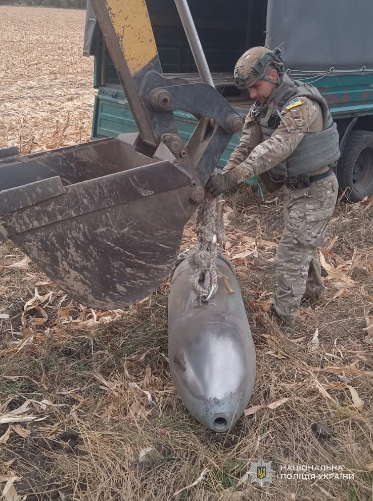 Під час нанесення ворогом чергового авіаційного удару по Сумщині авіабомбами ФАБ-500 з універсальним модулем планування і корекції, одна з них впала на полі та не спрацювала.