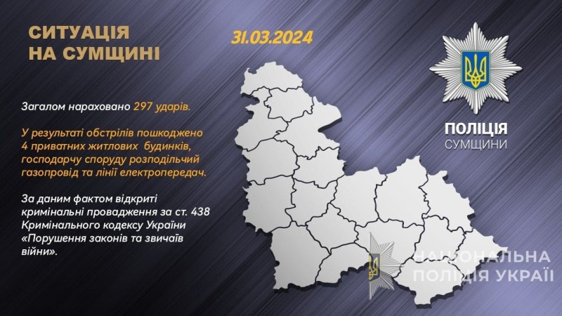 Упродовж минулої доби російські війська вкотре обстрілювали територію області. Загалом зафіксовано 297 ударів.