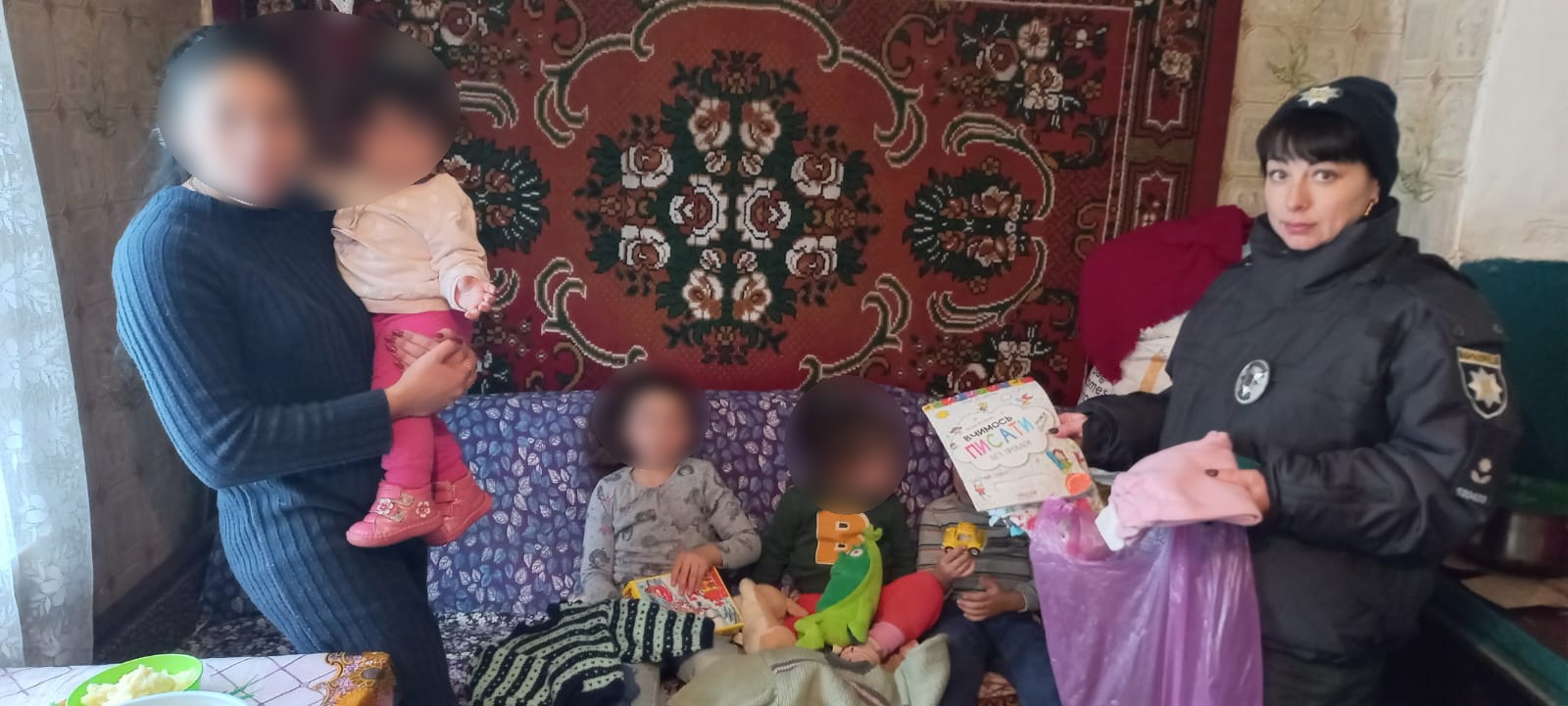 Окрім цього, гості завітали до сімей «не з пустими руками», а привезли подарунки. За сприяння Тростянецької міської ради, правоохоронці надали сім’ям матеріальну допомогу, зокрема дитячі теплі речі, продукти харчування, дитяче харчування та іграшки.