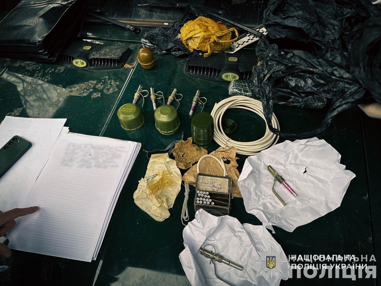 Під час обшуків за місцем мешкання фігуранта поліцейські виявили особисті документи потерпілого, у тому числі документи права власності на нерухоме майно та мобільні телефони. Окрім того, на території домоволодіння зловмисника виявлено та вилучено більше пів кілограма пластичної вибухової речовини, 1 гранату,1 корпус гранати, 6 запалів до гранат,19 капсулів-детонаторів, 2 електродетонатора, ,запалювальну трубку та вогнепровідний шнур.