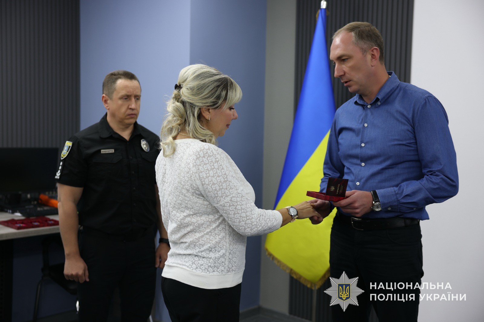На початку заходу присутні вшанували хвилиною мовчання пам’ять колег та захисників, які віддали своє життя в боротьбі за свободу й незалежність нашої держави. Далі, відповідно до Указу Президента України, орденом «За мужність» ІІІ ступеня (посмертно) нагороджено полковника поліції Ігоря Поладича, який загинув минулого року, рятуючи людей під час обстрілу міста. Нагороду отримала його дружина Оксана.