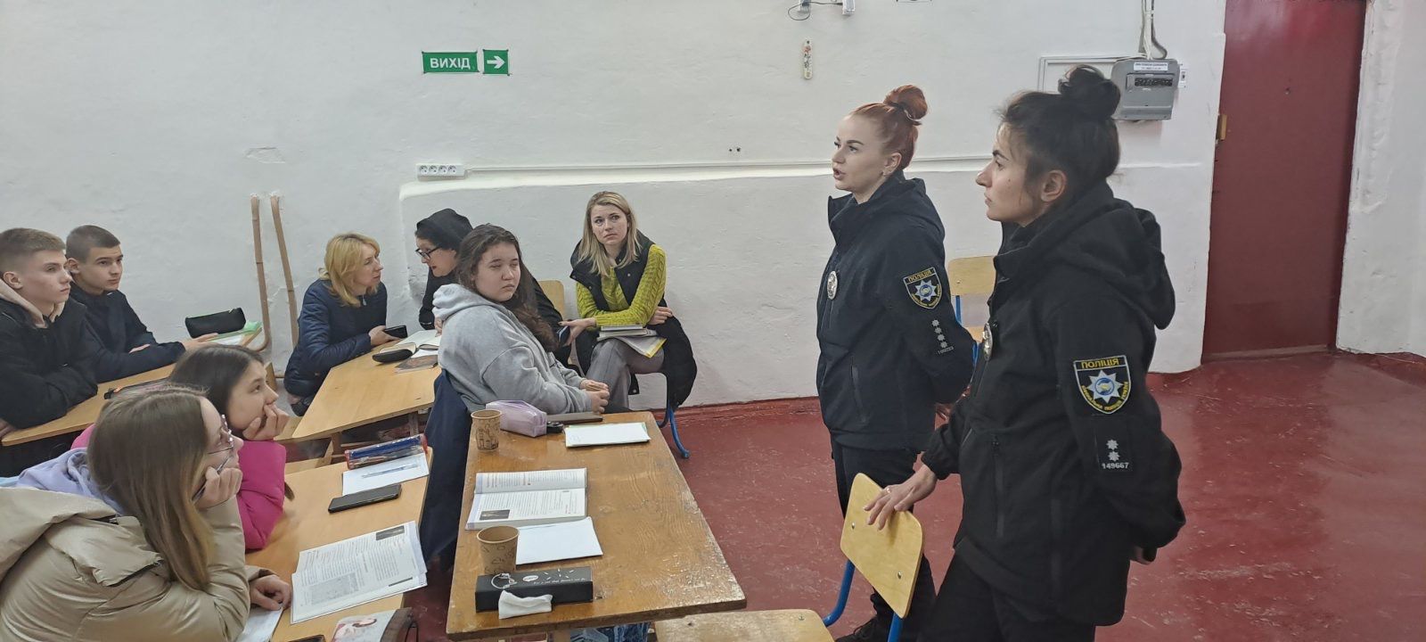 Зустріч з інспекторами проходила у приміщенні укриття навчального закладу, оскільки перед початком заходу пролунав сигнал «Повітряна тривога», тому користуючись нагодою поліцейські разом з дітьми згадали правила, яких потрібно дотримуватися в такій ситуації та за яким алгоритмом діяти.