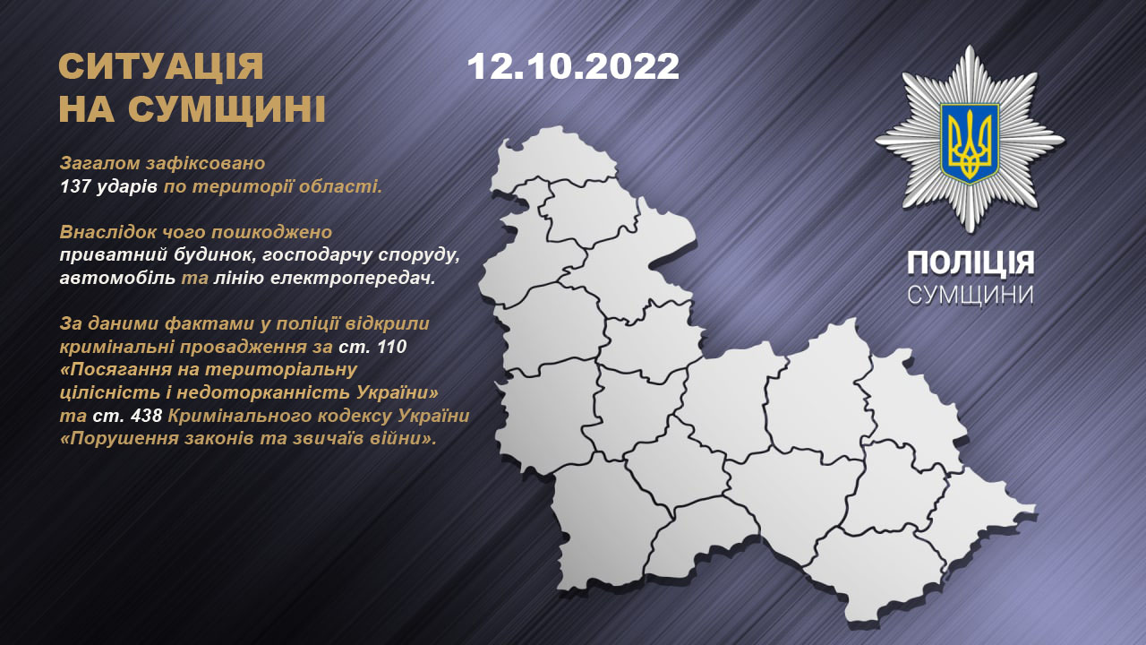Протягом минулої доби окупанти обстрілювали прикордонні населені пункти області. Загалом нараховано 137 ударів. Внаслідок чого пошкоджено приватний будинок, господарчу споруду, автомобіль та лінію електропередач.