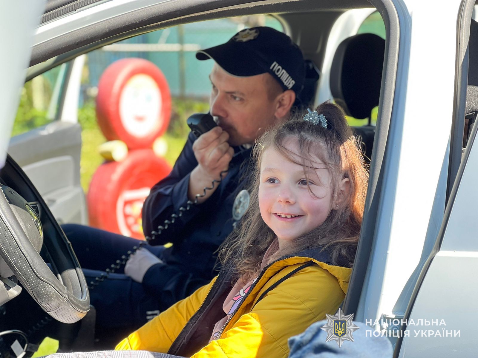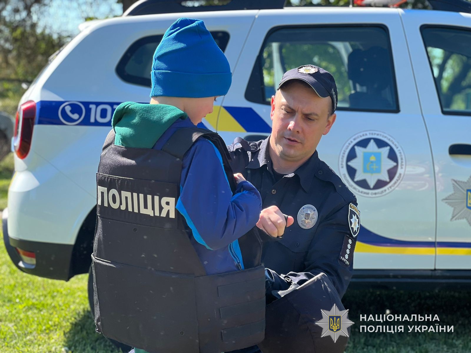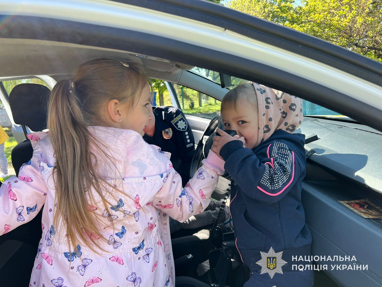 Начальник сектору взаємодії з громадами показав свій службовий автомобіль та поліцейське екіпірування. Дітвора з захватом розглядали транспортний та приміряли дитячі засоби захисту – шолом та бронежилет.