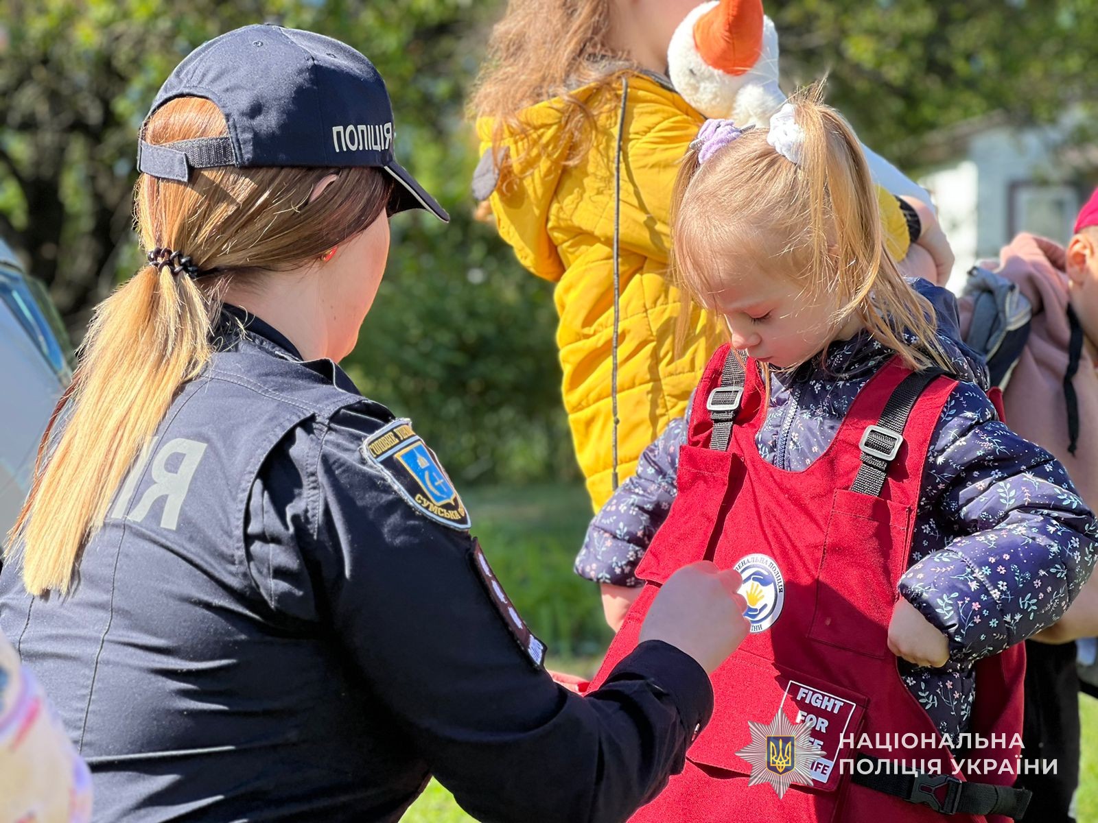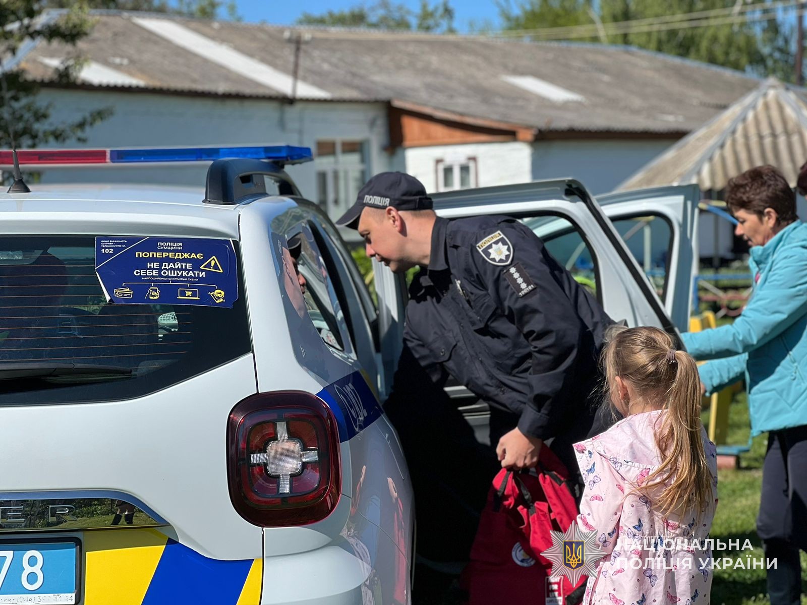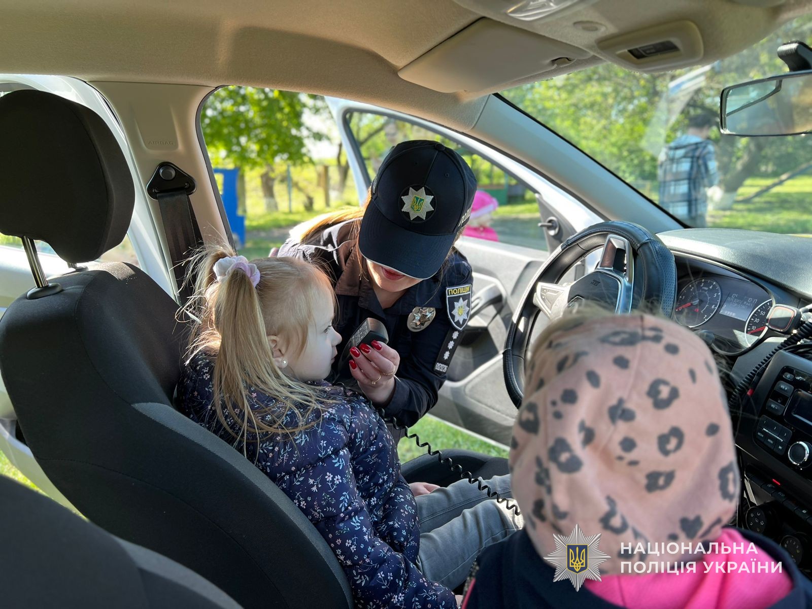 Начальник сектору взаємодії з громадами показав свій службовий автомобіль та поліцейське екіпірування. Дітвора з захватом розглядали транспортний та приміряли дитячі засоби захисту – шолом та бронежилет.