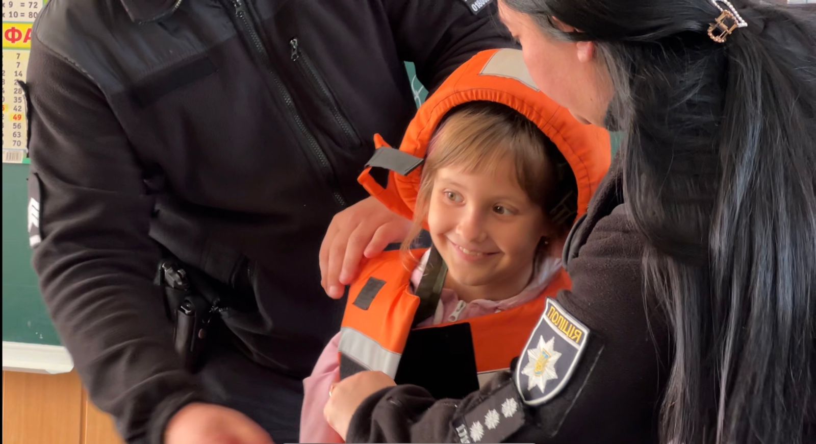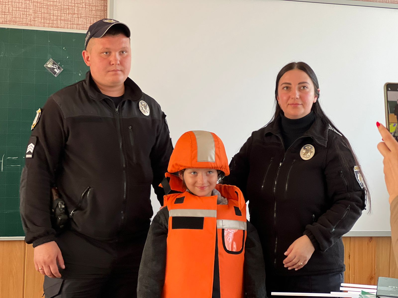 Далі інспекторка розказала дітям про мінну безпеку та важливість своєчасного реагування на сигнали повітряної тривоги. Після цього діти мали змогу приміряти дитячі засоби особистого захисту – шоломи та жилети.