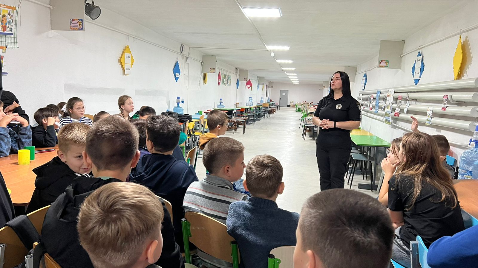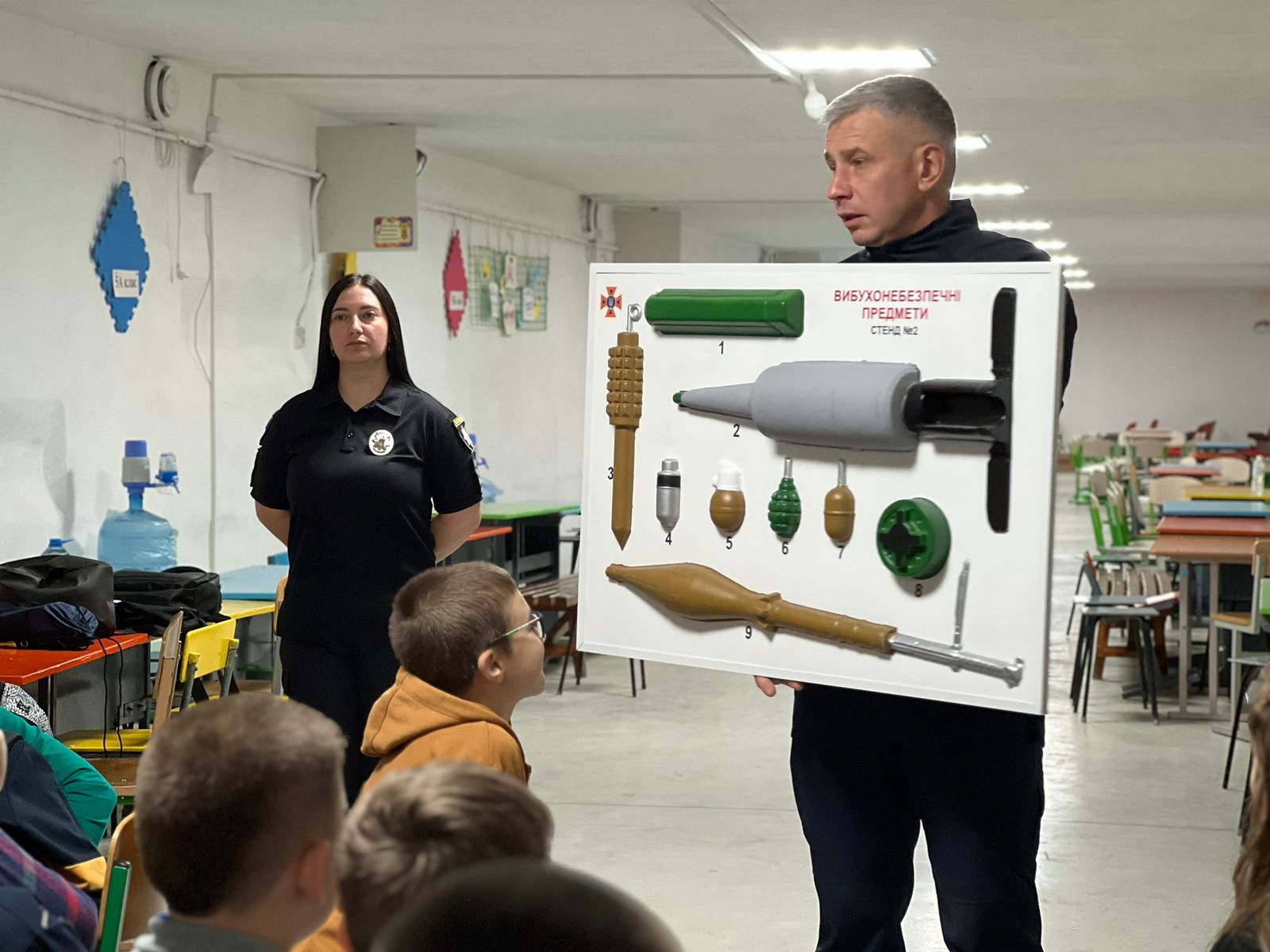 Працівник ДСНС показав дітям як можуть виглядати вибухонебезпечні предмети та розказав про три головних правила при виявленні таких предметів: не підходь, не рухай, телефонуй 101 та 102. Також рятувальник розказав про причини виникнення пожежі.