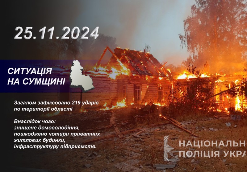 Упродовж доби по території Сумської області нараховано 219 ударів. Загалом 43 населених пункти піддавалися обстрілам з території рф з різних видів озброєння.