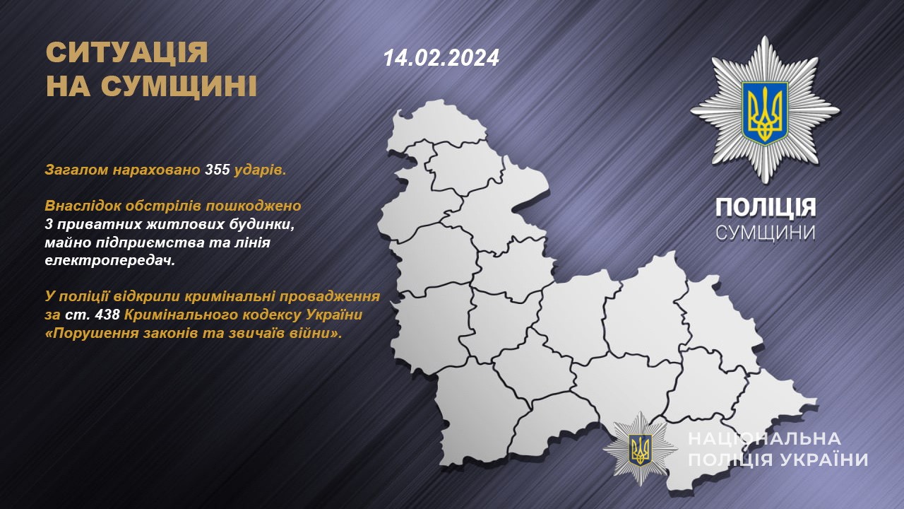 Упродовж доби російські війська 49 разів обстріляли населені пункти Сумської області з території рф. Загалом нараховано 355 приходів.