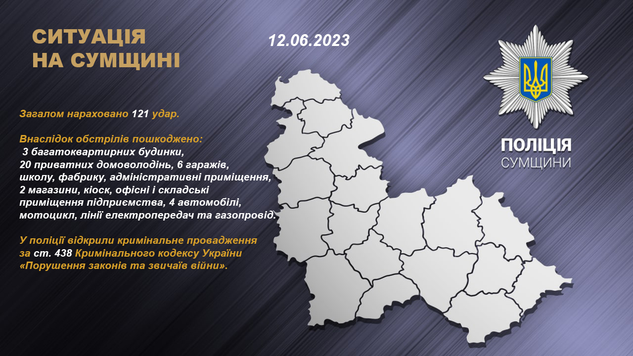 Минулої доби окупанти знову відкривав вогонь по прикордонним громадам Сумської області. Загалом нараховано 121 удар.