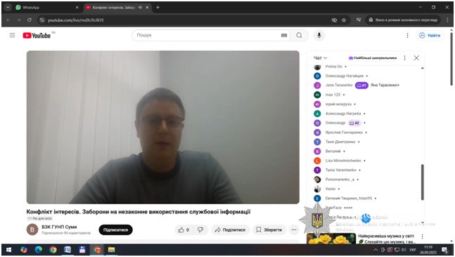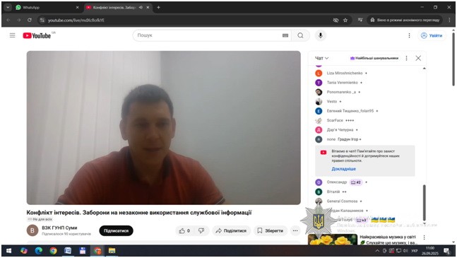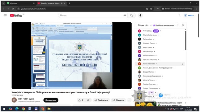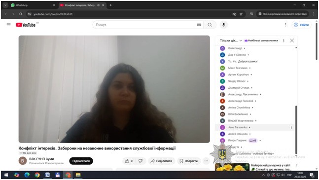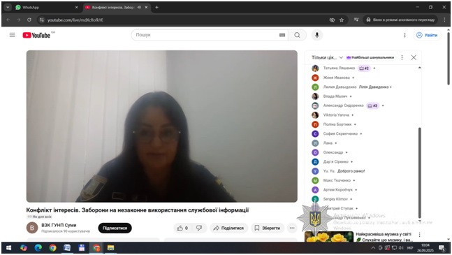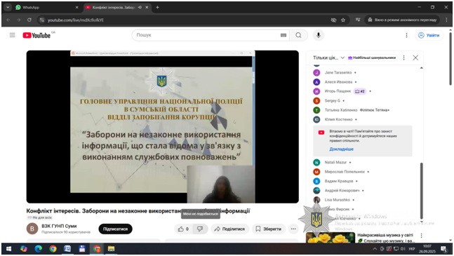 За ініціативою відділу запобігання корупції Головного управління Національної поліції в Сумській області, з метою обізнаності та дотримання вимог, заборон та обмежень антикорупційного законодавства, спільно з представниками Департаменту стратегічних розслідувань НПУ та Сумської обласної прокуратури проведено навчання для поліцейських Сумської області на теми: «Заборони та незаконне використання інформації, що стала відома у зв’язку з виконанням службових обов’язків» та «Конфлікт інтересів. Врегулювання конфлікту інтересів під час проведення службових розслідувань, при розгляді заяв, скарг громадян».