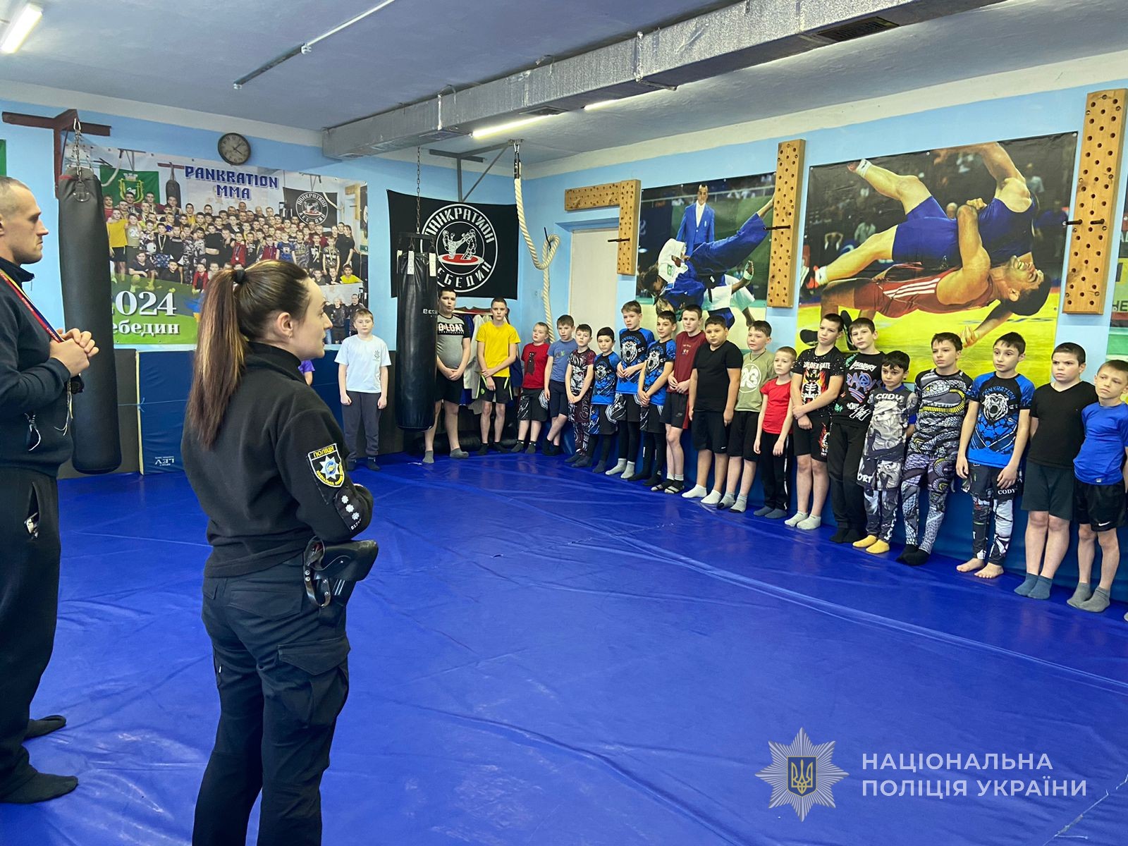 Крім цього, ювенальна поліцейська відділення поліції № 3 (м. Лебедин) завітала на тренування до вихованців Лебединської міської федерації панкратіону України. Разом з дітьми інспекторка поліції долучилася до фізичної зарядки, яка неодмінно проходить перед початком кожного тренування. Також, побажала гідно представити Сумщину на запланованих змаганнях.