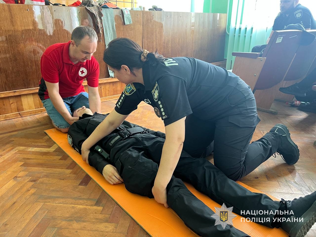 Інструктор з першої допомоги Національного комітету Українського Червоного Хреста моделював для учасників різні екстремальні ситуації, в яких правоохоронці відпрацьовували злагоджені, впевнені та швидкі дії в умовах наближених до реальних.