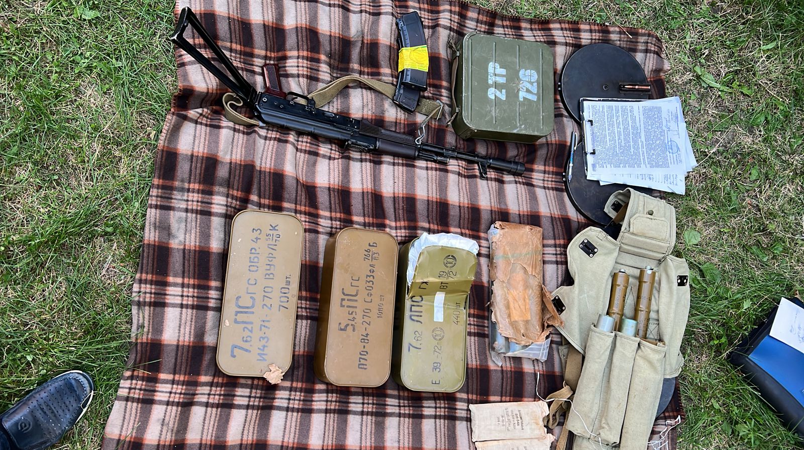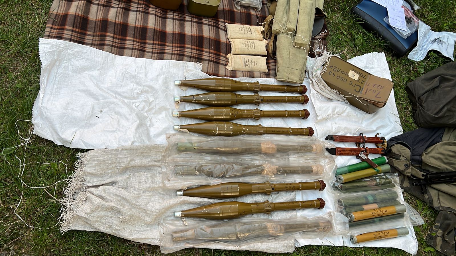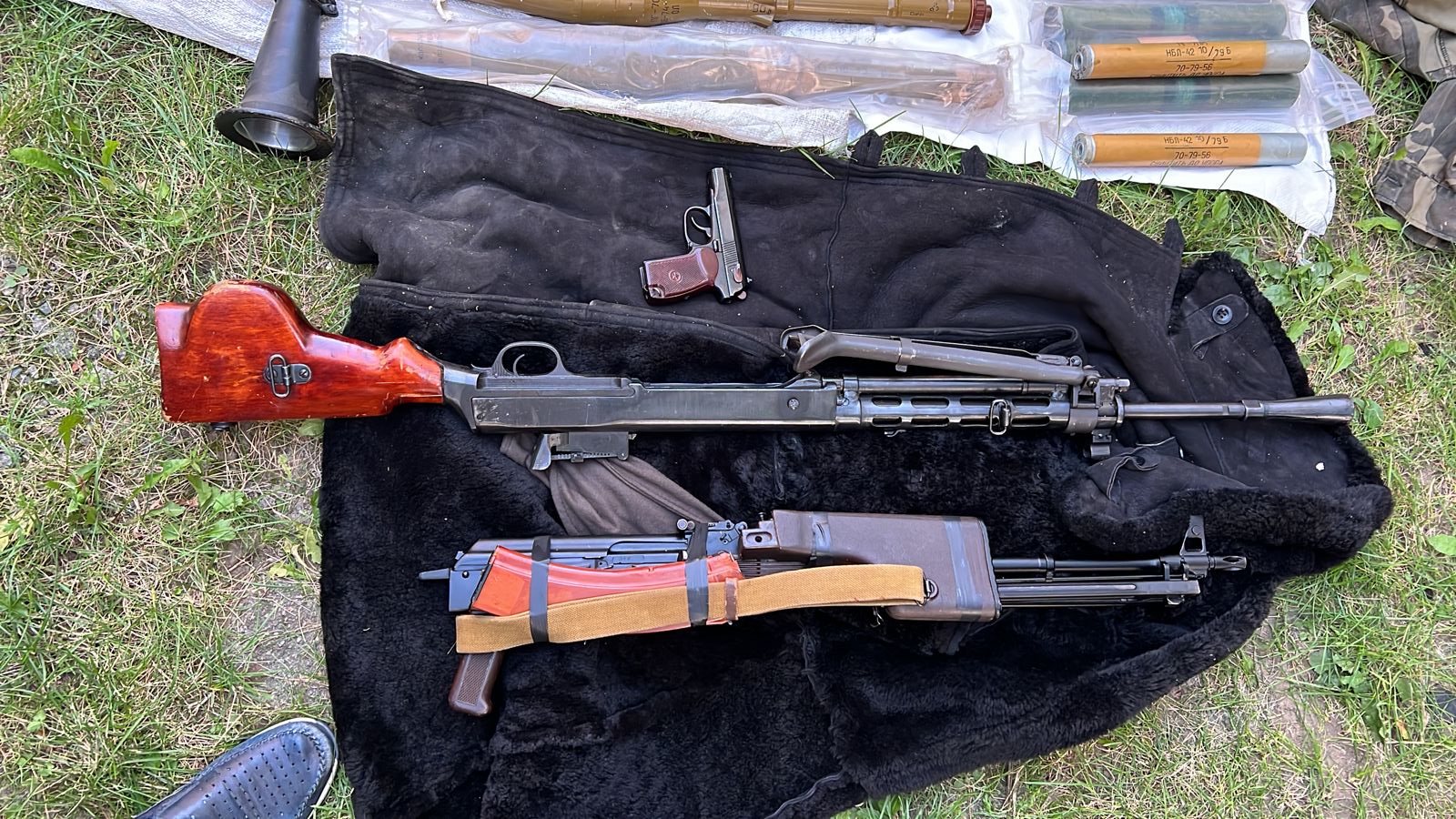 Крім того, під час проведення санкціонованих обшуків у двох вимагачів виявлено автоматичну зброю калібру 5.45мм, ручний кулемет Калашникова калібру 7.62мм, кулемет Дегтярьова калібру 7.62мм, 3 ручні протитанкові гранатомети РПГ7-В, пістолет Макарова калібру 9мм, набої в кількості 5843 штук калібру 5.45 та 7.62 мм в ящиках та магазинах, 12 зарядів до РПГ, 10 гранатометних пострілів ПГ-7ПМ, 2 корпуси від ВОГ-17, 9 гранат Ф-1, РГД-5, РГО, 4 запали УЗРГМ, УДЗ, 3 міни СМ-УЧ, артилерійський постріл, 5 упаковок трубчастого артилерійського пороху, нарізний ствол великокаліберного танкового кулемета Владімірова, 5 штик-ножів, предмет циліндричної форми схожий на вибухівку, триногу та станину для кулемету.