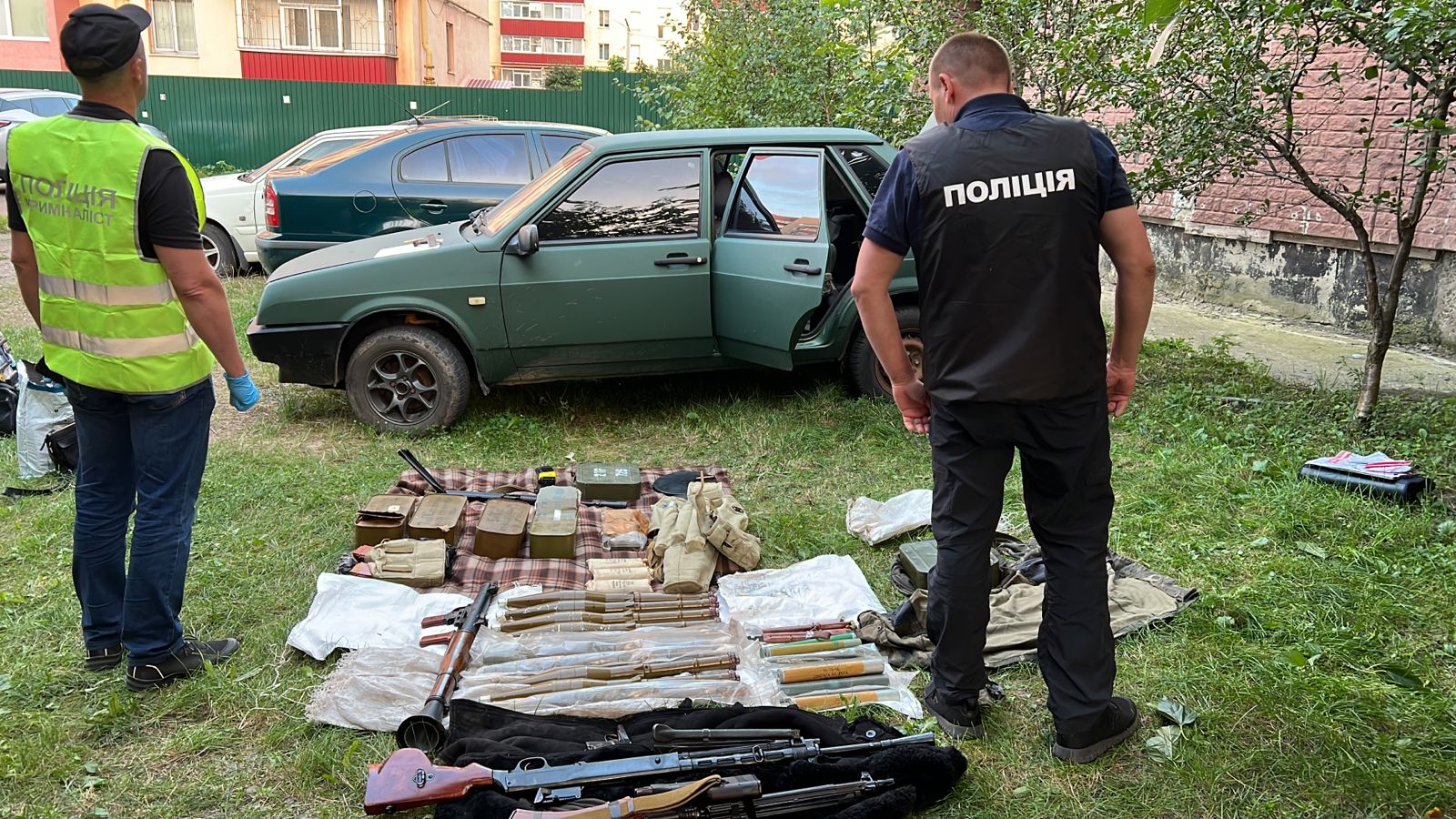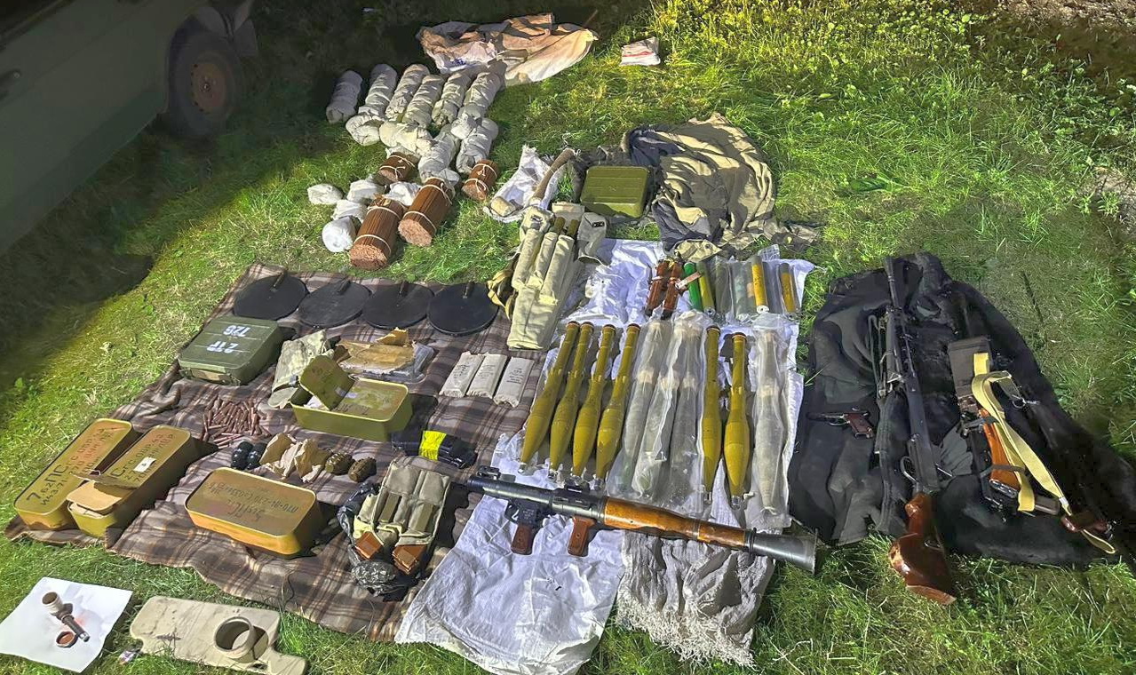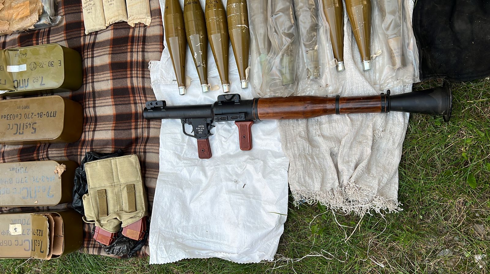 Крім того, під час проведення санкціонованих обшуків у двох вимагачів виявлено автоматичну зброю калібру 5.45мм, ручний кулемет Калашникова калібру 7.62мм, кулемет Дегтярьова калібру 7.62мм, 3 ручні протитанкові гранатомети РПГ7-В, пістолет Макарова калібру 9мм, набої в кількості 5843 штук калібру 5.45 та 7.62 мм в ящиках та магазинах, 12 зарядів до РПГ, 10 гранатометних пострілів ПГ-7ПМ, 2 корпуси від ВОГ-17, 9 гранат Ф-1, РГД-5, РГО, 4 запали УЗРГМ, УДЗ, 3 міни СМ-УЧ, артилерійський постріл, 5 упаковок трубчастого артилерійського пороху, нарізний ствол великокаліберного танкового кулемета Владімірова, 5 штик-ножів, предмет циліндричної форми схожий на вибухівку, триногу та станину для кулемету.